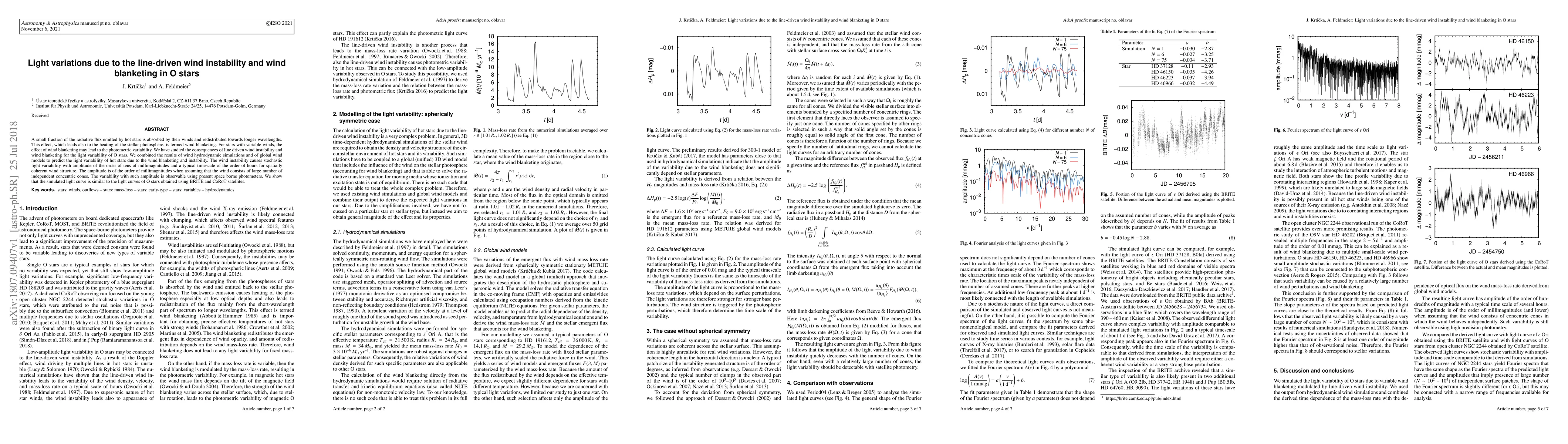 A small fraction of the radiative flux emitted by hot stars is absorbed by their winds and redistributed towards longer wavelengths. This effect, which leads also to the heating of the stellar photosphere, is termed wind blanketing. For stars with variable winds, the effect of wind blanketing may lead to the photometric variability. We have studied the consequences of line driven wind instability and wind blanketing for the light variability of O stars. We combined the results of wind hydrodynamic simulations and of global wind models to predict the light variability of hot stars due to the wind blanketing and instability. The wind instability causes stochastic light variability with amplitude of the order of tens of millimagnitudes and a typical timescale of the order of hours for spatially coherent wind structure. The amplitude is of the order of millimagnitudes when assuming that the wind consists of large number of independent concentric cones. The variability with such amplitude is observable using present space borne photometers. We show that the simulated light curve is similar to the light curves of O stars obtained using BRITE and CoRoT satellites.