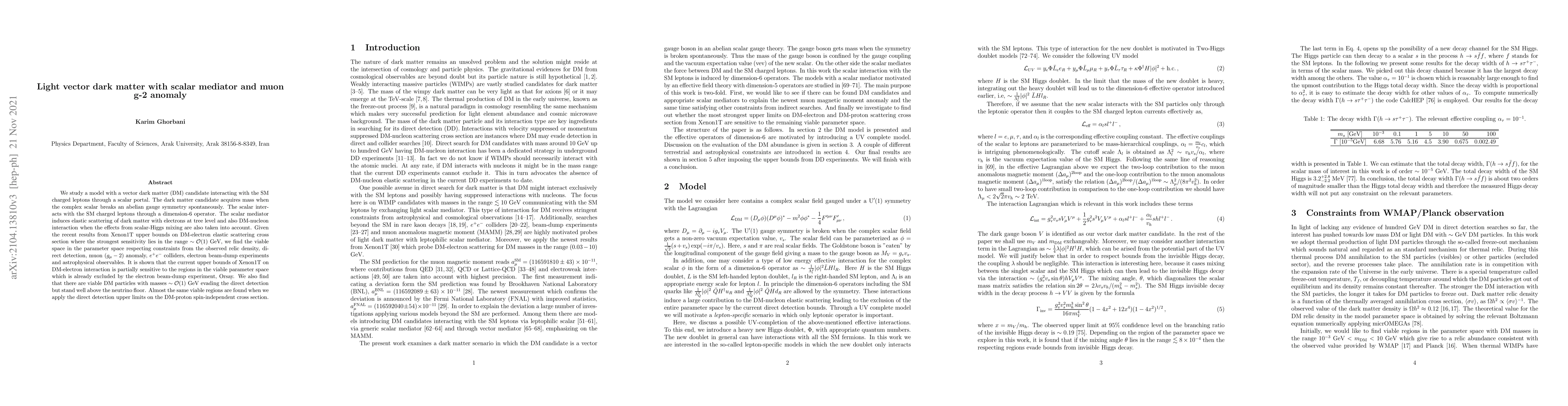This paper explores a vector dark matter model mediated by a scalar, addressing the muon g-2 anomaly and examining its compatibility with experimental constraints. It finds viable parameter spaces for dark matter masses around 1 GeV, which evade direct detection while fitting other observations.