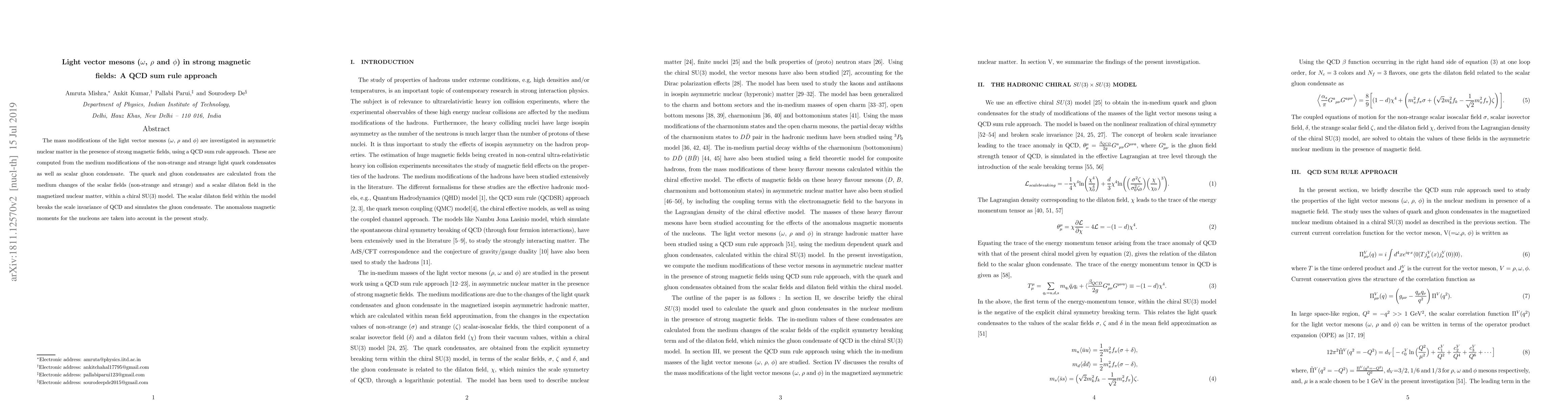 The mass modifications of the light vector mesons ($\omega$, $\rho$ and $\phi$) are investigated in asymmetric nuclear matter in the presence of strong magnetic fields, using a QCD sum rule approach. These are computed from the medium modifications of the non-strange and strange light quark condensates as well as scalar gluon condensate. The quark and gluon condensates are calculated from the medium changes of the scalar fields (non-strange and strange) and a scalar dilaton field in the magnetized nuclear matter, within a chiral SU(3) model. The scalar dilaton field within the model breaks the scale invariance of QCD and simulates the gluon condensate. The anomalous magnetic moments for the nucleons are taken into account in the present study.