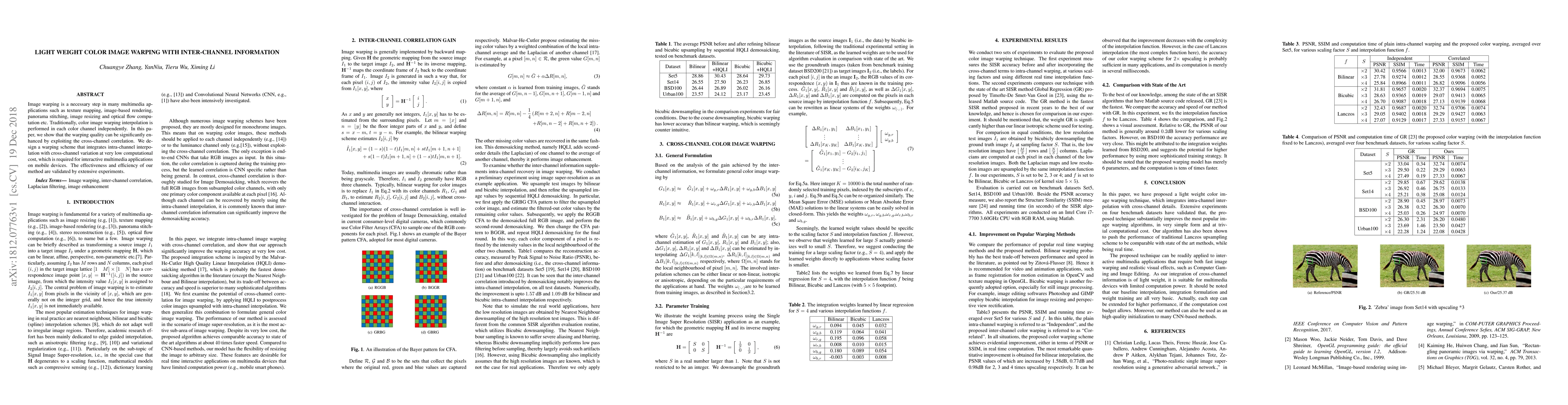 This paper proposes a lightweight color image warping method that enhances warping quality by leveraging cross-channel correlation, integrating intra-channel interpolation with cross-channel variation at minimal computational cost, suitable for interactive multimedia applications on mobile devices. The method's effectiveness and efficiency are confirmed through extensive experiments.