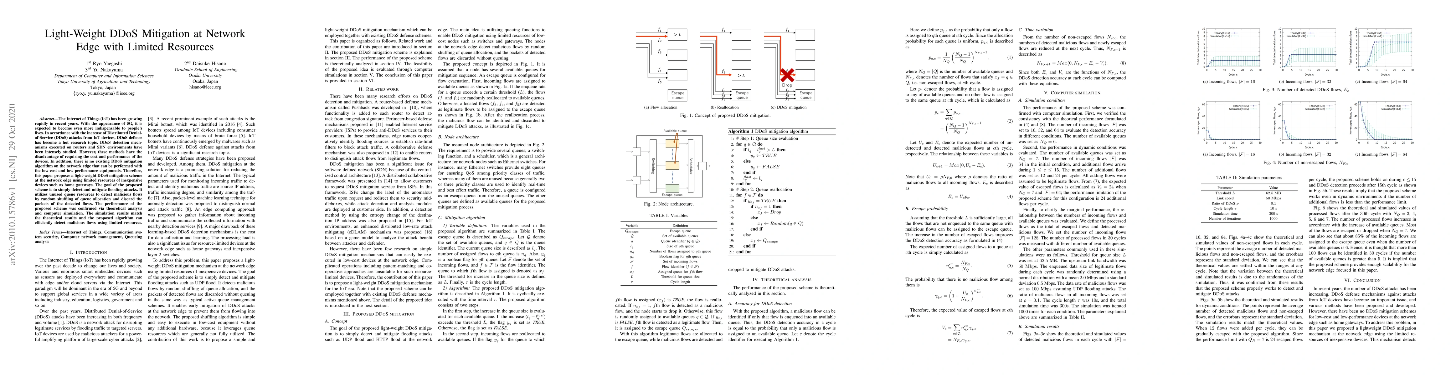 The Internet of Things (IoT) has been growing rapidly in recent years. With the appearance of 5G, it is expected to become even more indispensable to people's lives. In accordance with the increase of Distributed Denial-of-Service (DDoS) attacks from IoT devices, DDoS defense has become a hot research topic. DDoS detection mechanisms executed on routers and SDN environments have been intensely studied. However, these methods have the disadvantage of requiring the cost and performance of the devices. In addition, there is no existing DDoS mitigation algorithm on the network edge that can be performed with the low-cost and low performance equipments. Therefore, this paper proposes a light-weight DDoS mitigation scheme at the network edge using limited resources of inexpensive devices such as home gateways. The goal of the proposed scheme is to simply detect and mitigate flooding attacks. It utilizes unused queue resources to detect malicious flows by random shuffling of queue allocation and discard the packets of the detected flows. The performance of the proposed scheme was confirmed via theoretical analysis and computer simulation. The simulation results match the theoretical results and the proposed algorithm can efficiently detect malicious flows using limited resources.