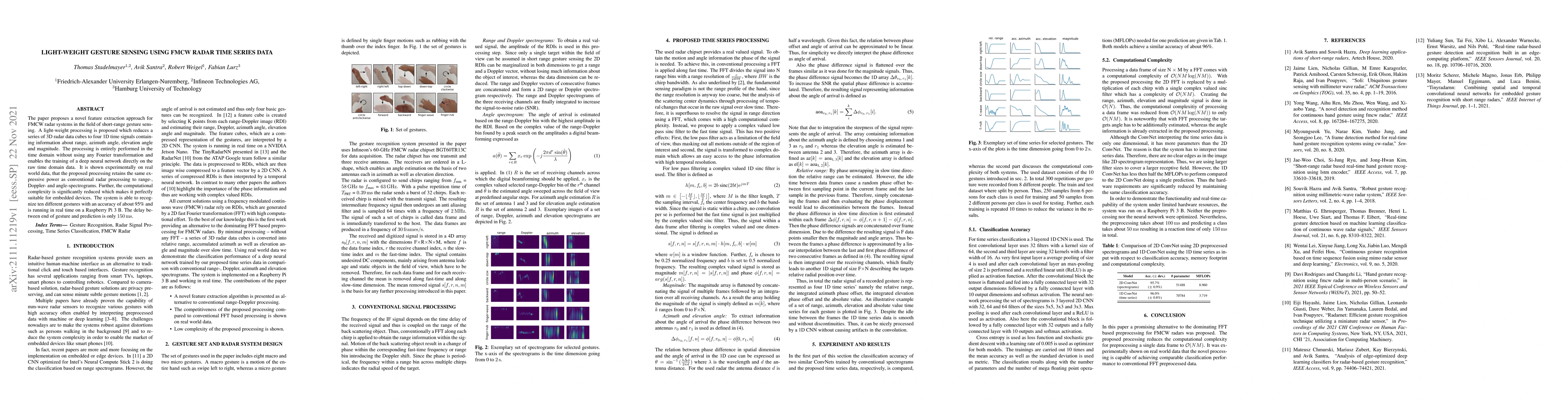 The paper presents a lightweight feature extraction method for FMCW radar, converting 3D radar data into four 1D time signals for gesture recognition. This time-domain processing approach enables real-time deep neural network training on raw data, achieving 95% accuracy with a 150 ms delay on a Raspberry Pi 3 B.