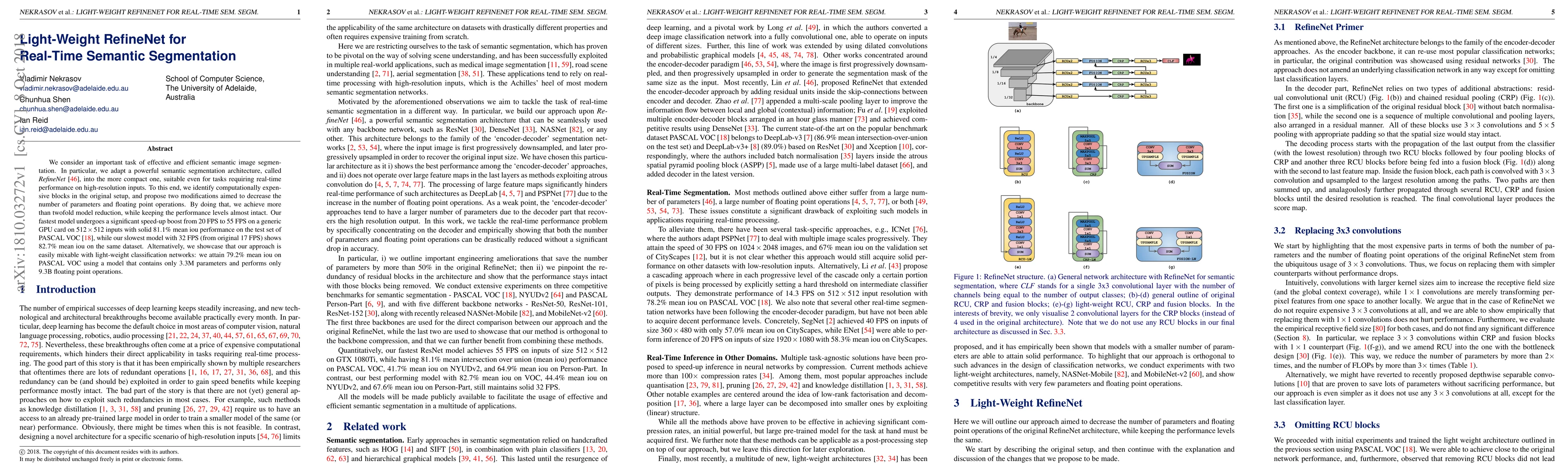 We consider an important task of effective and efficient semantic image segmentation. In particular, we adapt a powerful semantic segmentation architecture, called RefineNet, into the more compact one, suitable even for tasks requiring real-time performance on high-resolution inputs. To this end, we identify computationally expensive blocks in the original setup, and propose two modifications aimed to decrease the number of parameters and floating point operations. By doing that, we achieve more than twofold model reduction, while keeping the performance levels almost intact. Our fastest model undergoes a significant speed-up boost from 20 FPS to 55 FPS on a generic GPU card on 512x512 inputs with solid 81.1% mean iou performance on the test set of PASCAL VOC, while our slowest model with 32 FPS (from original 17 FPS) shows 82.7% mean iou on the same dataset. Alternatively, we showcase that our approach is easily mixable with light-weight classification networks: we attain 79.2% mean iou on PASCAL VOC using a model that contains only 3.3M parameters and performs only 9.3B floating point operations.