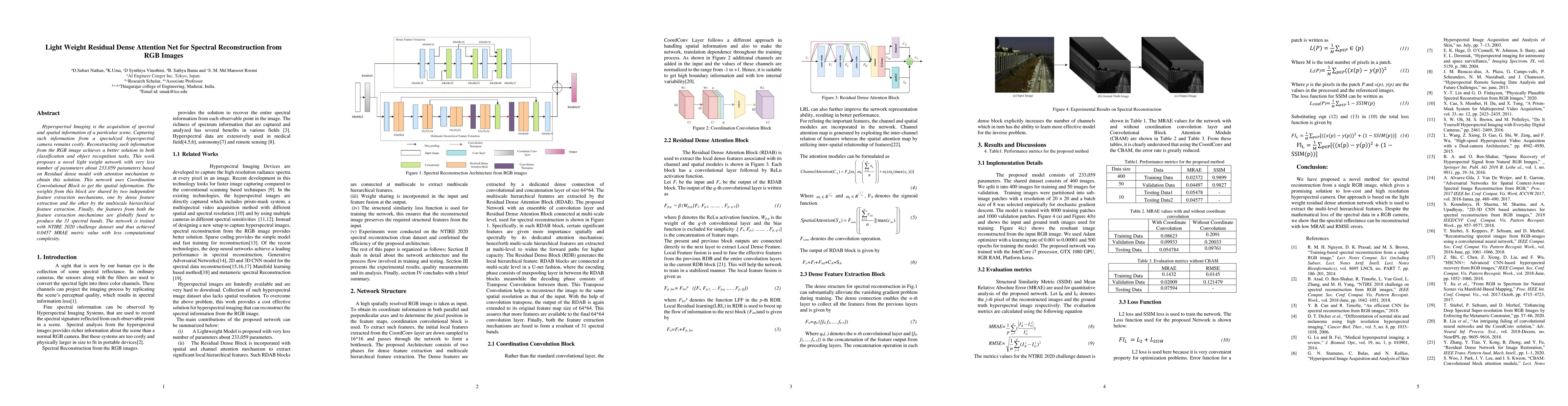 Hyperspectral Imaging is the acquisition of spectral and spatial information of a particular scene. Capturing such information from a specialized hyperspectral camera remains costly. Reconstructing such information from the RGB image achieves a better solution in both classification and object recognition tasks. This work proposes a novel light weight network with very less number of parameters about 233,059 parameters based on Residual dense model with attention mechanism to obtain this solution. This network uses Coordination Convolutional Block to get the spatial information. The weights from this block are shared by two independent feature extraction mechanisms, one by dense feature extraction and the other by the multiscale hierarchical feature extraction. Finally, the features from both the feature extraction mechanisms are globally fused to produce the 31 spectral bands. The network is trained with NTIRE 2020 challenge dataset and thus achieved 0.0457 MRAE metric value with less computational complexity.