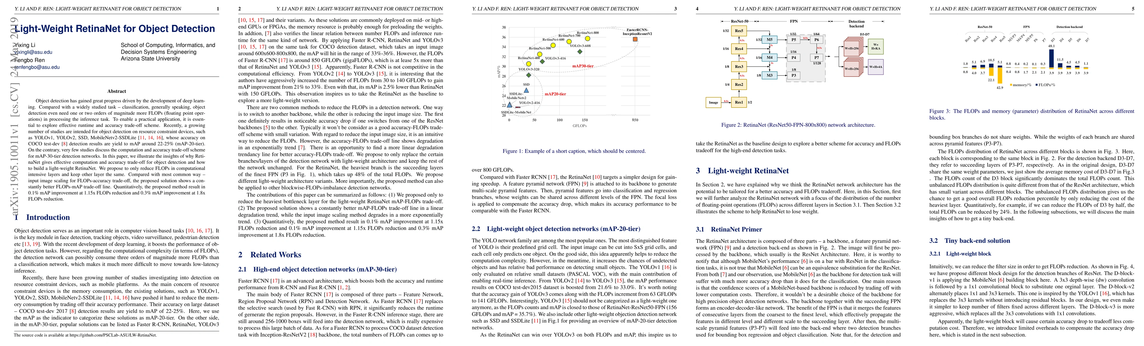 This paper proposes a light-weight RetinaNet for efficient object detection on resource-constrained devices, focusing on reducing FLOPs in computational intensive layers while maintaining others. The method achieves better FLOPs-mAP trade-off compared to scaling input images, resulting in mAP improvements of 0.1% at 1.15x FLOPs reduction and 0.3% at 1.8x reduction.