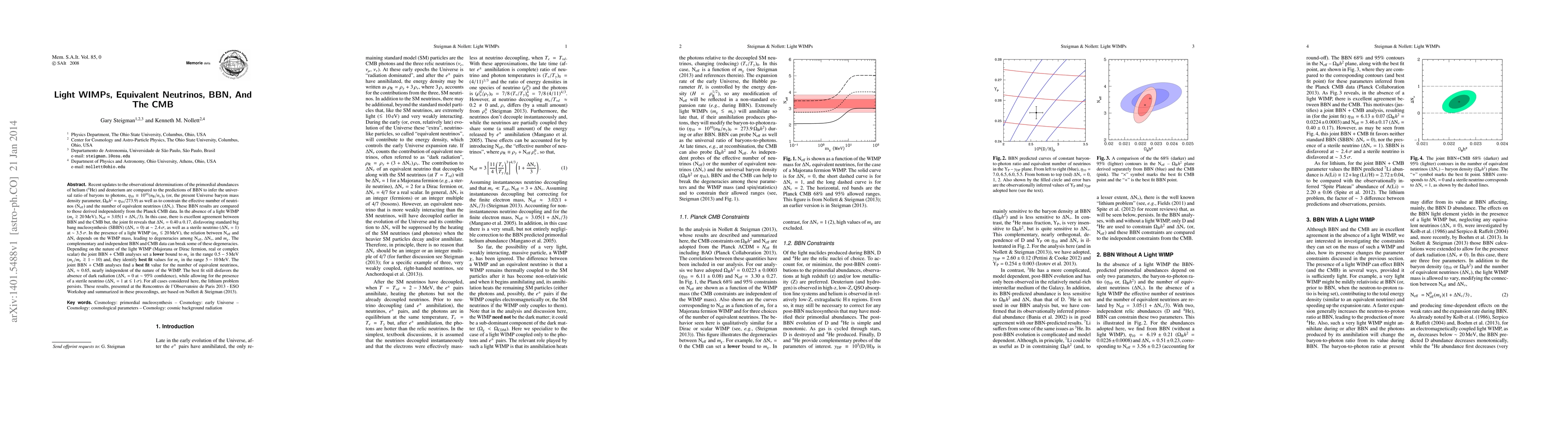 Recent updates to the observational determinations of the primordial abundances of helium and deuterium are compared to the predictions of BBN to infer the universal ratio of baryons to photons (or, the present Universe baryon mass density parameter Omega_B h^2), as well as to constrain the effective number of neutrinos (N_eff) and the number of equivalent neutrinos (Delta N_nu). These BBN results are compared to those derived independently from the Planck CMB data. In the absence of a light WIMP (chi), N_eff = 3.05(1 + Delta N_nu/3). In this case, there is excellent agreement between BBN and the CMB, but the joint fit finds that Delta N_nu = 0.40 +/- 0.17, disfavoring standard big bang nucleosynthesis (SBBN: Delta N_nu = 0) at 2.4 sigma, as well as a sterile neutrino (Delta N_nu = 1) at 3.5 sigma. In the presence of a light WIMP, the relation between N_eff and Delta N_nu depends on the WIMP mass, leading to degeneracies among N_eff, Delta N_nu, and m_chi. The complementary and independent BBN and CMB data can break some of these degeneracies. Depending on the nature of the light WIMP (Majorana or Dirac fermion, real or complex scalar) the joint BBN + CMB analyses set a lower bound to m_chi in the range from 0.5 to 5 MeV, and they identify best fit values for m_chi in the range from 5 to 10 MeV. The joint BBN + CMB analyses find a best fit value for the number of equivalent neutrinos, Delta N_nu = 0.65, nearly independent of the nature of the WIMP. The best fit still disfavors the absence of dark radiation (Delta N_nu = 0 at 95% confidence), while allowing for the presence of a sterile neutrino (Delta N_nu = 1 at less than 1 sigma). For all cases considered here, the lithium problem persists. These results, presented at the 2013 Rencontres de l'Observatoire de Paris - ESO Workshop, are based on Nollett & Steigman 2013 (arXiv:1312.5725 [astro-ph.CO]).