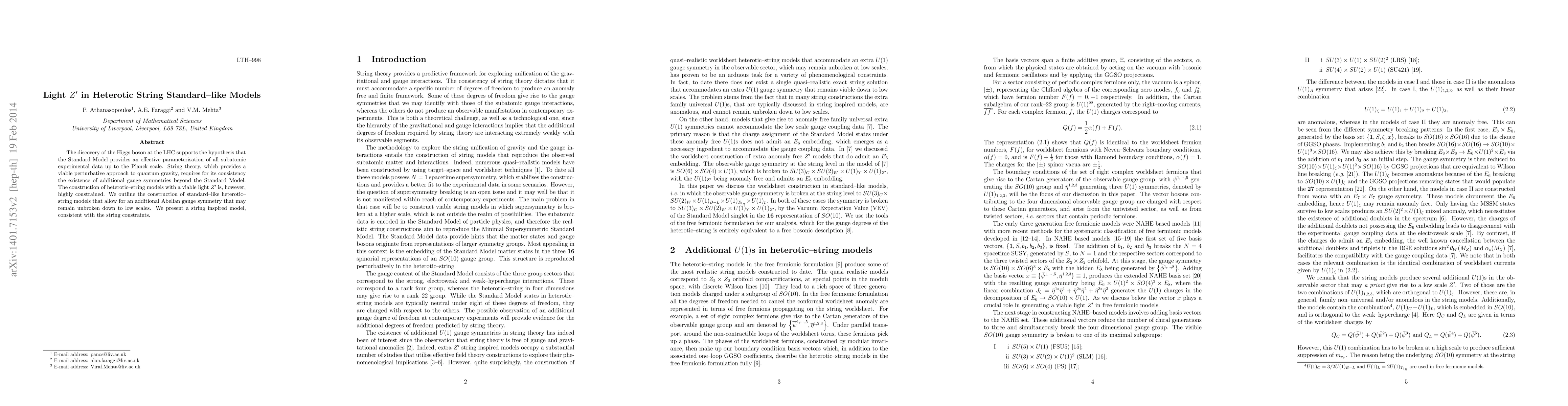 The discovery of the Higgs boson at the LHC supports the hypothesis that the Standard Model provides an effective parameterisation of all subatomic experimental data up to the Planck scale. String theory, which provides a viable perturbative approach to quantum gravity, requires for its consistency the existence of additional gauge symmetries beyond the Standard Model. The construction of heterotic--string models with a viable light $Z^\prime$ is, however, highly constrained. We outline the construction of standard--like heterotic--string models that allow for an additional Abelian gauge symmetry that may remain unbroken down to low scales. We present a string inspired model, consistent with the string constraints.