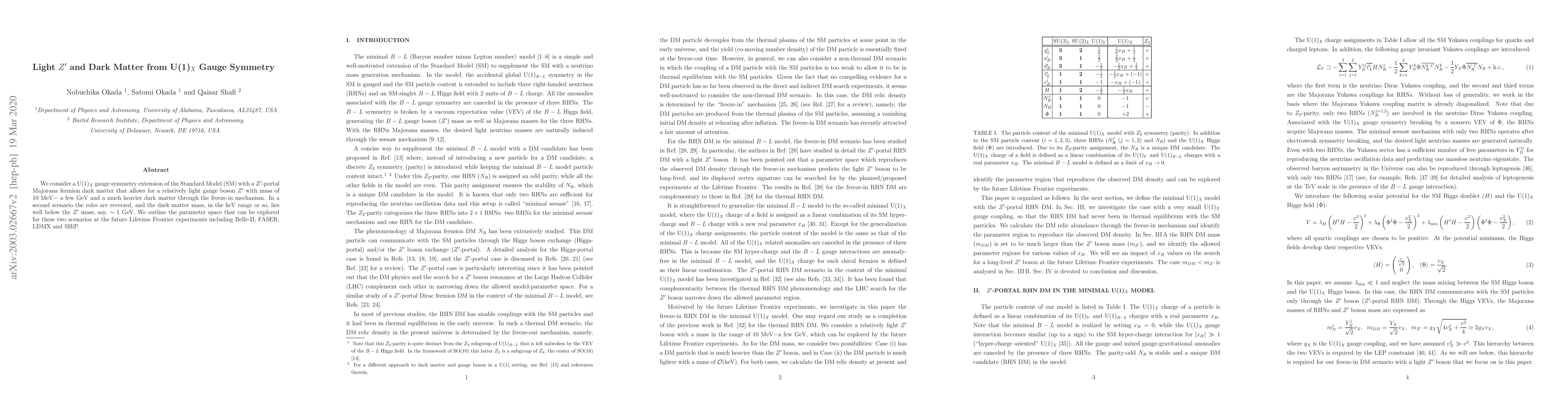 This paper explores a U(1)$_X$ gauge symmetry extension of the Standard Model featuring a $Z^\prime$ boson and Majorana fermion dark matter. It examines two scenarios: one where the $Z^\prime$ is light and dark matter is heavier, and another where dark matter is light and $Z^\prime$ is heavier, outlining potential experimental searches at future facilities.