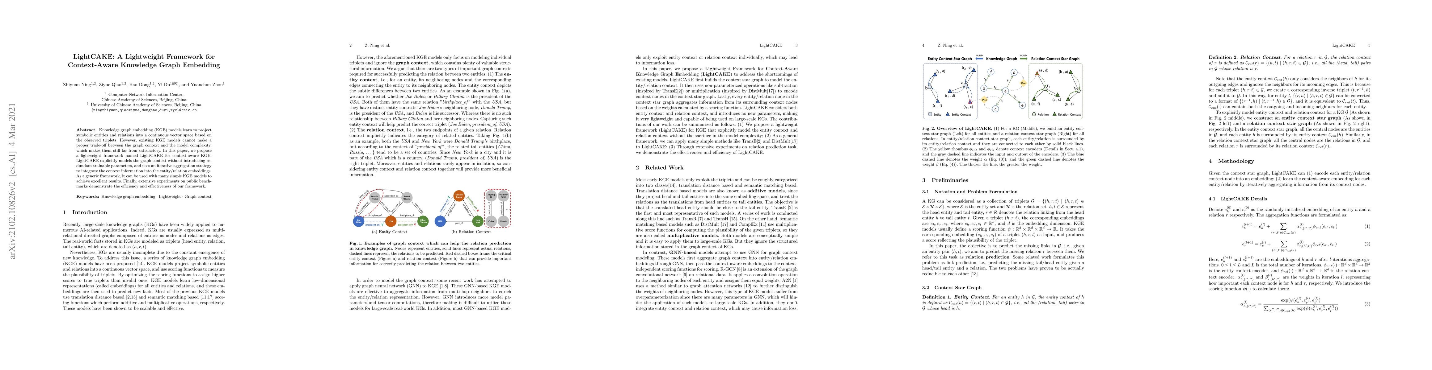 LightCAKE is a lightweight framework for context-aware knowledge graph embedding that balances graph context with model complexity. It integrates context information iteratively without adding redundant parameters, enhancing the performance of various KGE models, as shown by successful experiments on public benchmarks.
