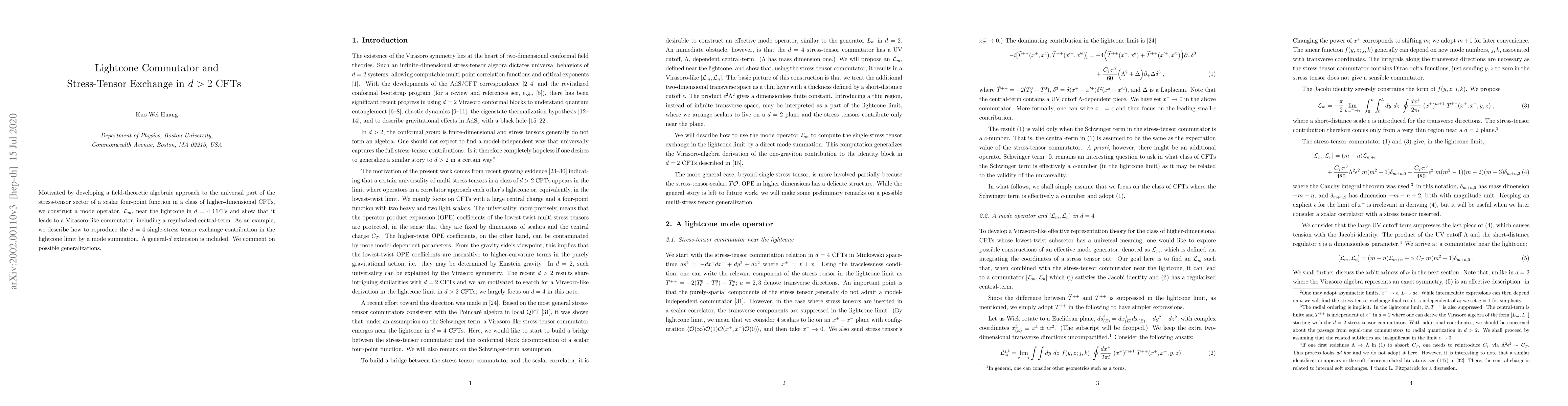 Motivated by developing a field-theoretic algebraic approach to the universal part of the stress-tensor sector of a scalar four-point function in a class of higher-dimensional CFTs, we construct a mode operator, ${\cal L}_m$, near the lightcone in $d=4$ CFTs and show that it leads to a Virasoro-like commutator, including a regularized central-term. As an example, we describe how to reproduce the $d=4$ single-stress tensor exchange contribution in the lightcone limit by a mode summation. A general-$d$ extension is included. We comment on possible generalizations.