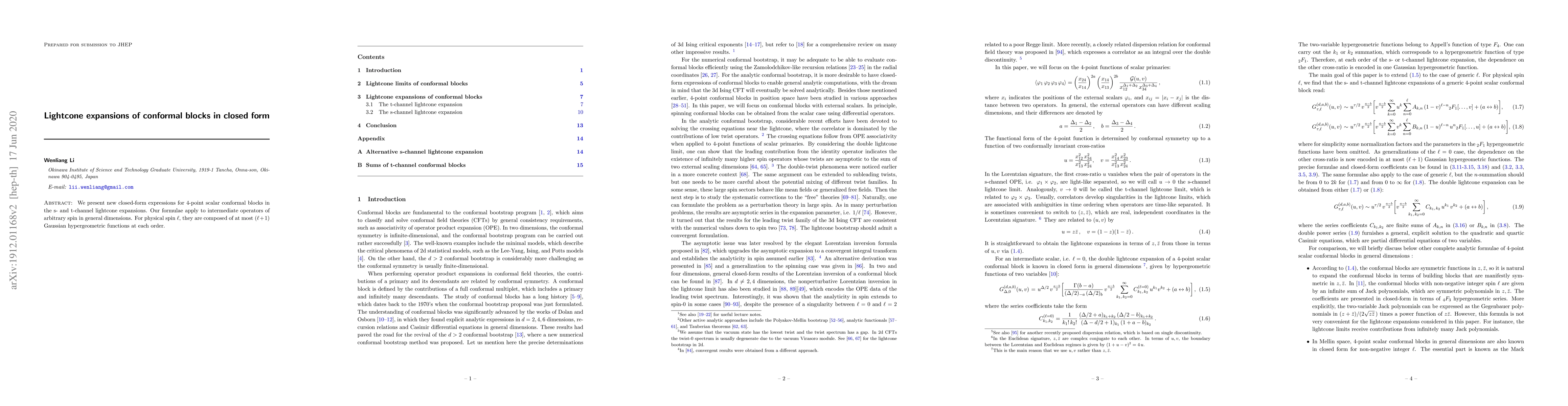 Summary: This paper introduces closed-form expressions for 4-point scalar conformal blocks in lightcone expansions, applicable to operators of any spin in various dimensions, with physical spin $\ell$ represented by at most $(\ell+1)$ Gaussian hypergeometric functions per order.