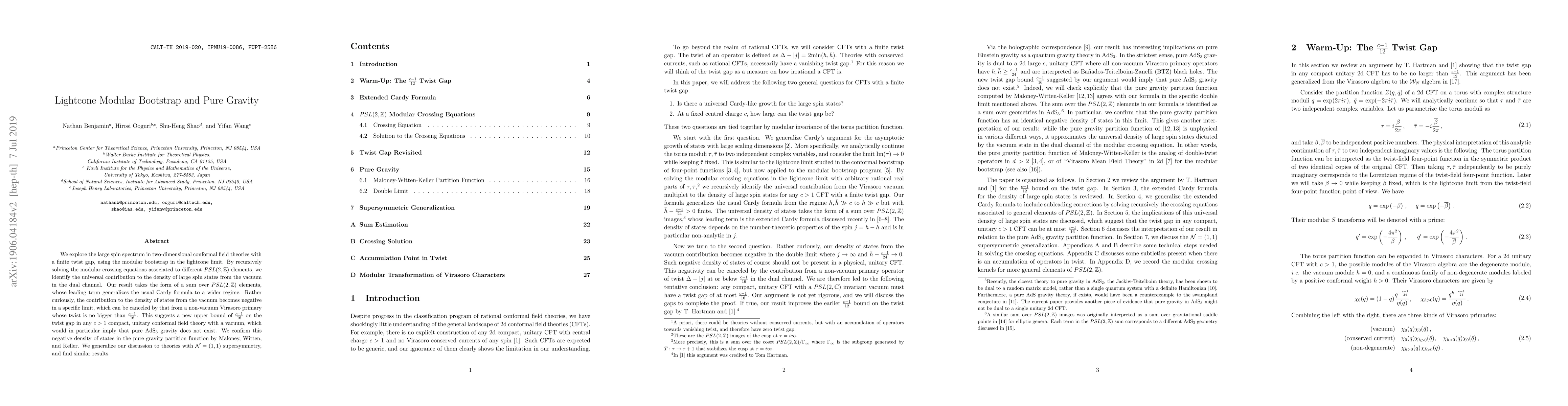 The paper uses lightcone modular bootstrap to analyze the large spin spectrum in 2D CFTs, identifying a universal density of states contribution from the vacuum. It reveals a negative density from the vacuum that can be canceled by a non-vacuum primary, suggesting an upper bound of $\frac{c-1}{16}$ on the twist gap and implying pure AdS$_3$ gravity does not exist.