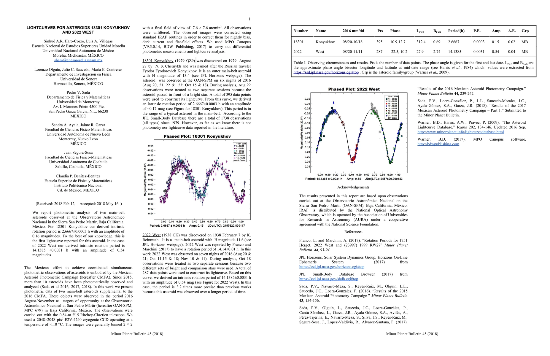 We report photometric analysis of two main-belt asteroids observed at the Observatorio Astronomico Nacional in the Sierra San Pedro Martir, Baja California, M\'exico. For 18301 Konyukhov our derived intrinsic rotation period is 2.6667 $\pm$ 0.0003 h with an amplitude of 0.16 magnitudes. To the best of our knowledge, this is the first lightcurve reported for this asteroid. In the case of 2022 West our derived intrinsic rotation period is 14.1385 $\pm$ 0.0031 h with an amplitude of 0.54 magnitudes.