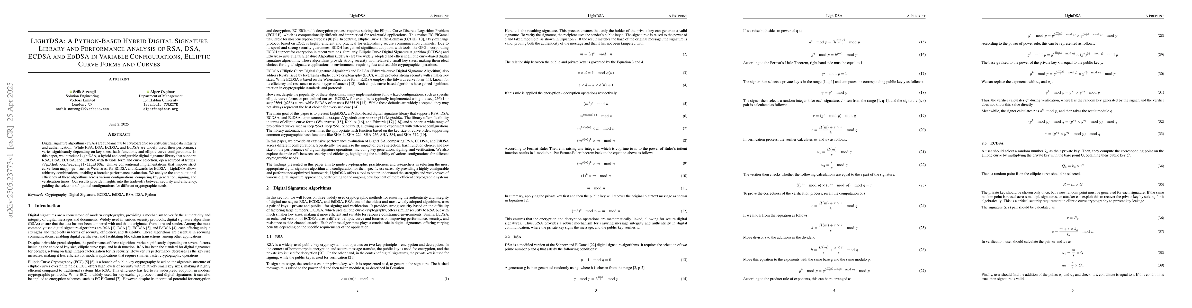 Digital signature algorithms (DSAs) are fundamental to cryptographic security, ensuring data integrity and authentication. While RSA, DSA, ECDSA, and EdDSA are widely used, their performance varies significantly depending on key sizes, hash functions, and elliptic curve configurations. In this paper, we introduce LightDSA, a hybrid and configurable digital signature library that supports RSA, DSA, ECDSA, and EdDSA with flexible form and curve selection, open sourced at https://github.com/serengil/LightDSA. Unlike conventional implementations that impose strict curve-form mappings - such as Weierstrass for ECDSA and Edwards for EdDSA LightDSA - allows arbitrary combinations, enabling a broader performance evaluation. We analyze the computational efficiency of these algorithms across various configurations, comparing key generation, signing, and verification times. Our results provide insights into the trade-offs between security and efficiency, guiding the selection of optimal configurations for different cryptographic needs.