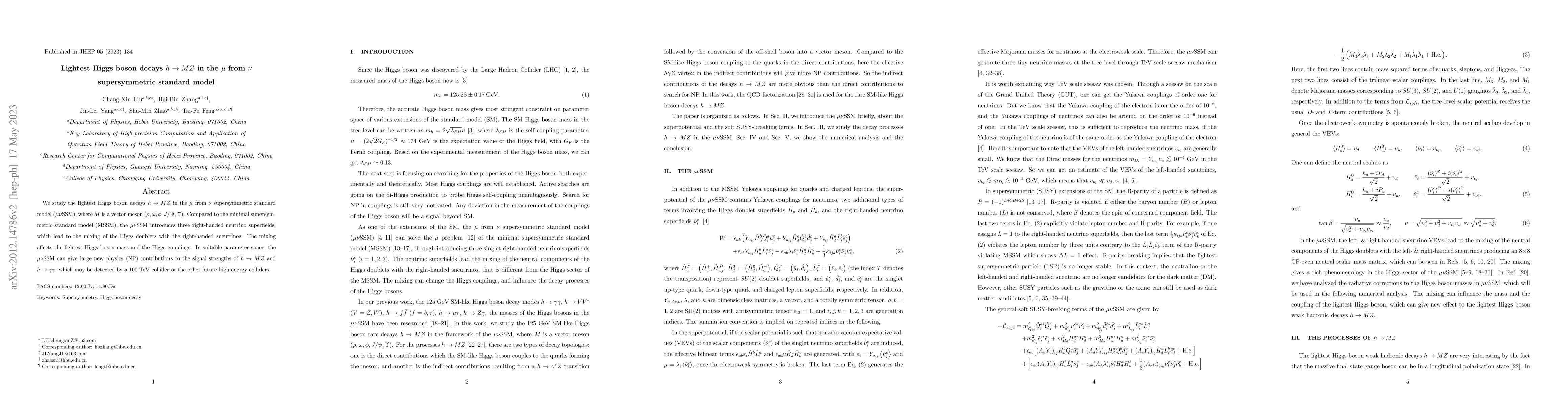 This paper investigates the decay of the lightest Higgs boson into vector mesons ($h\rightarrow MZ$) in the $\mu$ from $\nu$ supersymmetric standard model ($\mu\nu$SSM), highlighting how the model's unique right-handed neutrino superfields can lead to significant new physics contributions detectable at future high-energy colliders.