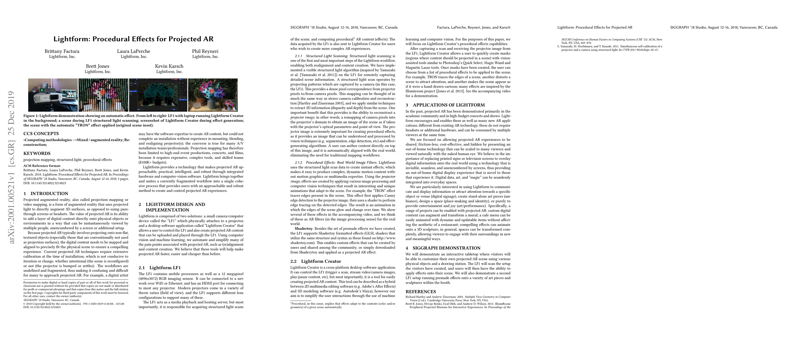 Lightform introduces a new technology for procedural effects in projected augmented reality, simplifying the complex calibration and alignment processes. It integrates hardware and computer-vision software to create a unified workflow, making projected AR more accessible and adaptable for various applications beyond high-end productions.
