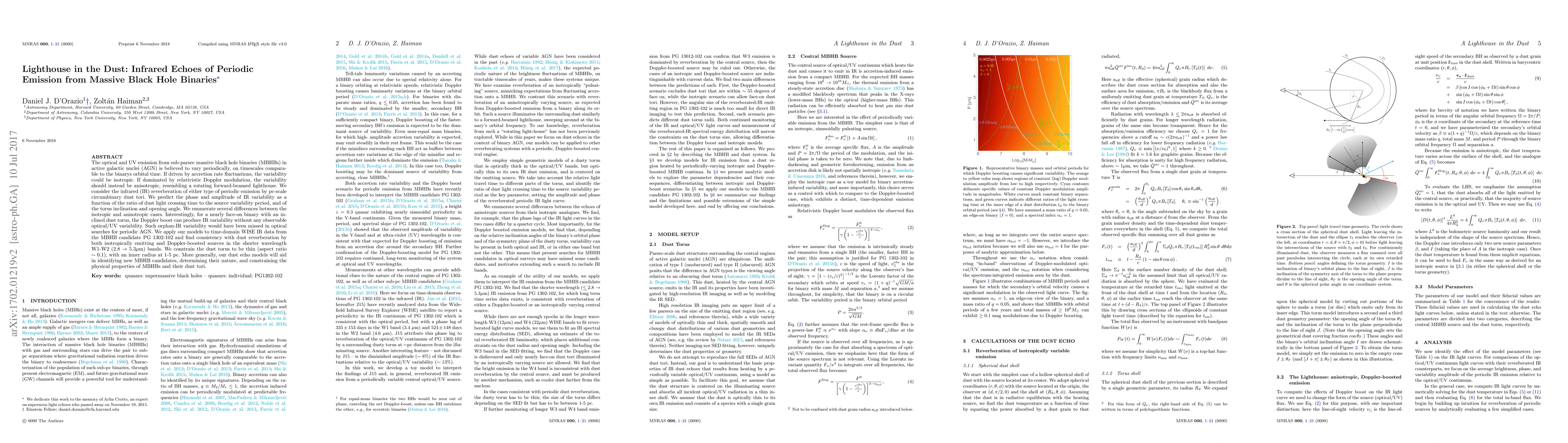 The optical and UV emission from sub-parsec massive black hole binaries (MBHBs) in active galactic nuclei (AGN) is believed to vary periodically, on timescales comparable to the binary's orbital time. If driven by accretion rate fluctuations, the variability could be isotropic. If dominated by relativistic Doppler modulation, the variability should instead be anisotropic, resembling a rotating forward-beamed lighthouse. We consider the infrared (IR) reverberation of either type of periodic emission by pc-scale circumbinary dust tori. We predict the phase and amplitude of IR variability as a function of the ratio of dust light crossing time to the source variability period, and of the torus inclination and opening angle. We enumerate several differences between the isotropic and anisotropic cases. Interestingly, for a nearly face-on binary with an inclined dust torus, the Doppler boost can produce IR variability without any observable optical/UV variability. Such orphan-IR variability would have been missed in optical searches for periodic AGN. We apply our models to time-domain WISE IR data from the MBHB candidate PG 1302-102 and find consistency with dust reverberation by both isotropically emitting and Doppler-boosted sources in the shorter wavelength W1-W2 (2.8-5.3 micrometer) bands. We constrain the dust torus to be thin (aspect ratio ~0.1), with an inner radius at 1-5 pc. More generally, our dust echo models will aid in identifying new MBHB candidates, determining their nature, and constraining the physical properties of MBHBs and their dust tori.