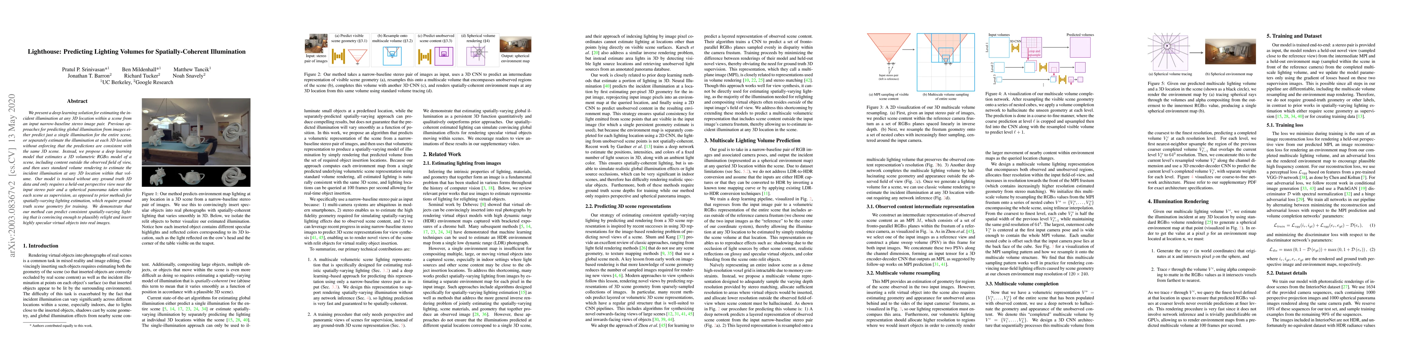 We present a deep learning solution for estimating the incident illumination at any 3D location within a scene from an input narrow-baseline stereo image pair. Previous approaches for predicting global illumination from images either predict just a single illumination for the entire scene, or separately estimate the illumination at each 3D location without enforcing that the predictions are consistent with the same 3D scene. Instead, we propose a deep learning model that estimates a 3D volumetric RGBA model of a scene, including content outside the observed field of view, and then uses standard volume rendering to estimate the incident illumination at any 3D location within that volume. Our model is trained without any ground truth 3D data and only requires a held-out perspective view near the input stereo pair and a spherical panorama taken within each scene as supervision, as opposed to prior methods for spatially-varying lighting estimation, which require ground truth scene geometry for training. We demonstrate that our method can predict consistent spatially-varying lighting that is convincing enough to plausibly relight and insert highly specular virtual objects into real images.
