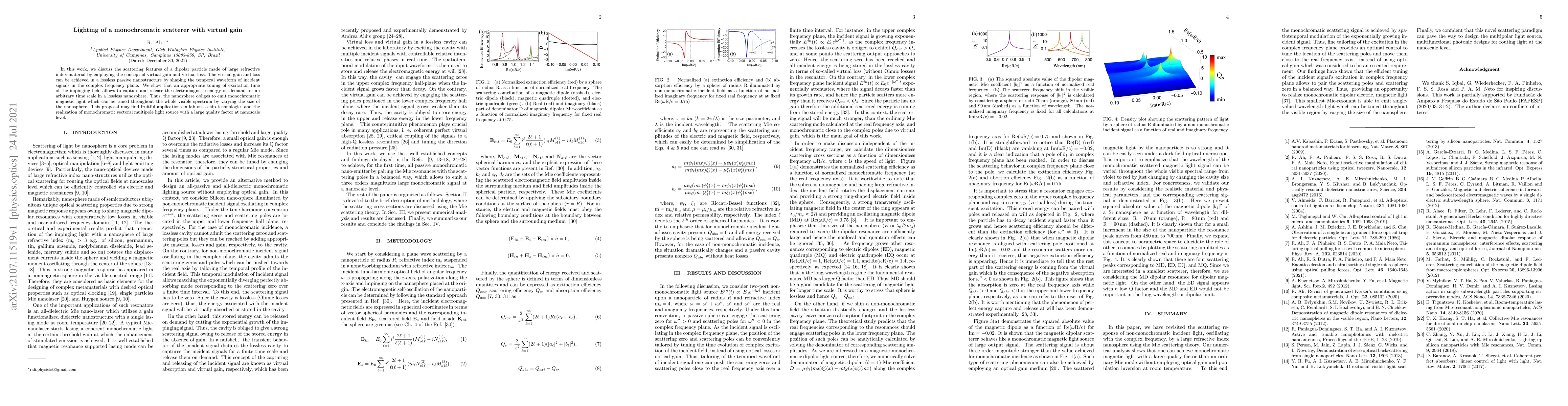 In this work, we discuss the scattering features of a dipolar particle made of large refractive index material by employing the concept of virtual gain and virtual loss. The virtual gain and loss can be achieved in a lossless passive nanostructure by shaping the temporal waveform of incident signals in the complex frequency plane. We show that an appropriate tuning of excitation time of the impinging field allows to capture and release the electromagnetic energy on-demand for an arbitrary time scale in a lossless nanosphere. Thus, the nanosphere obliges to emit monochromatic magnetic light which can be tuned throughout the whole visible spectrum by varying the size of the nanosphere. This proposal may find fruitful applications in lab-on-a-chip technologies and the realization of monochromatic sectoral multipole light source with a large quality factor at nanoscale level.