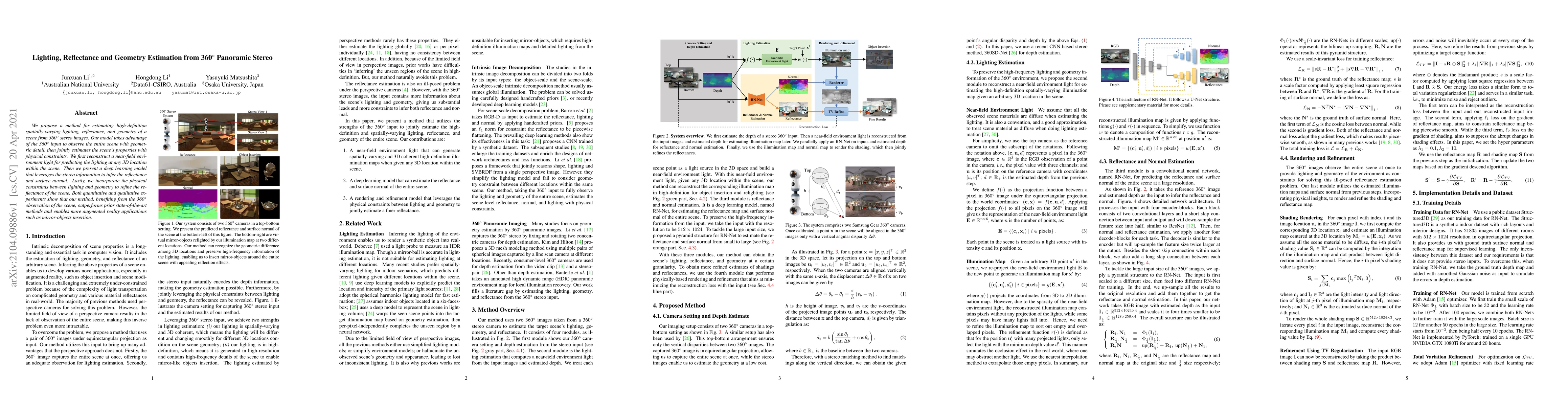This paper proposes a method for estimating lighting, reflectance, and geometry from 360° stereo panoramic images using a deep learning model that leverages the full scene context. The approach reconstructs environment light and refines reflectance with physical constraints, outperforming existing methods and enabling advanced augmented reality applications.