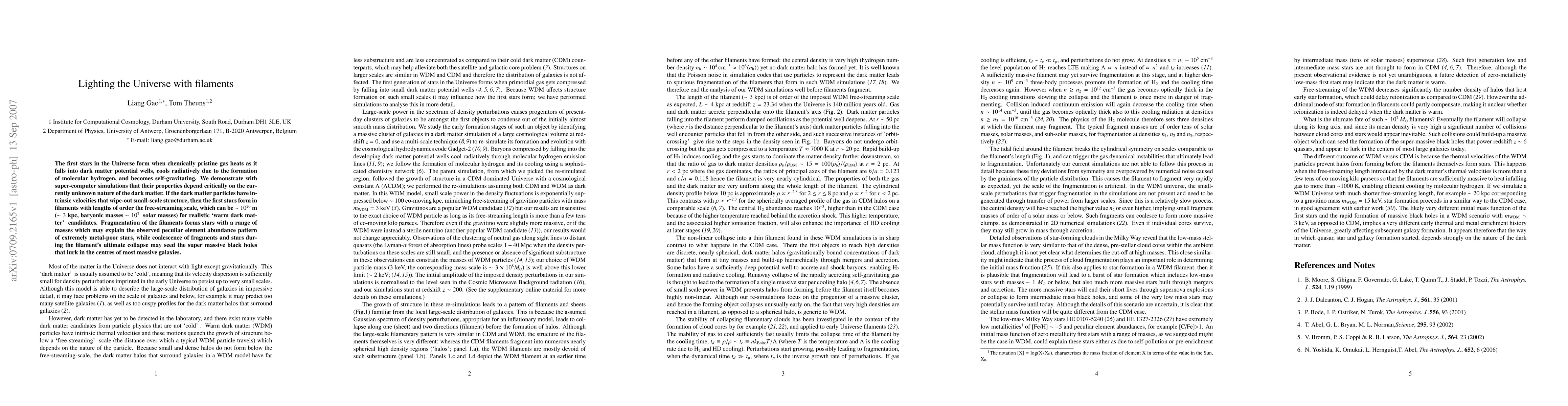 This study uses supercomputer simulations to show that the formation of the first stars depends on the nature of dark matter, specifically if it behaves like "warm dark matter." Stars form in filaments with masses around 10^7 solar masses, explaining the peculiar element abundances in extremely metal-poor stars and potentially seeding supermassive black holes.