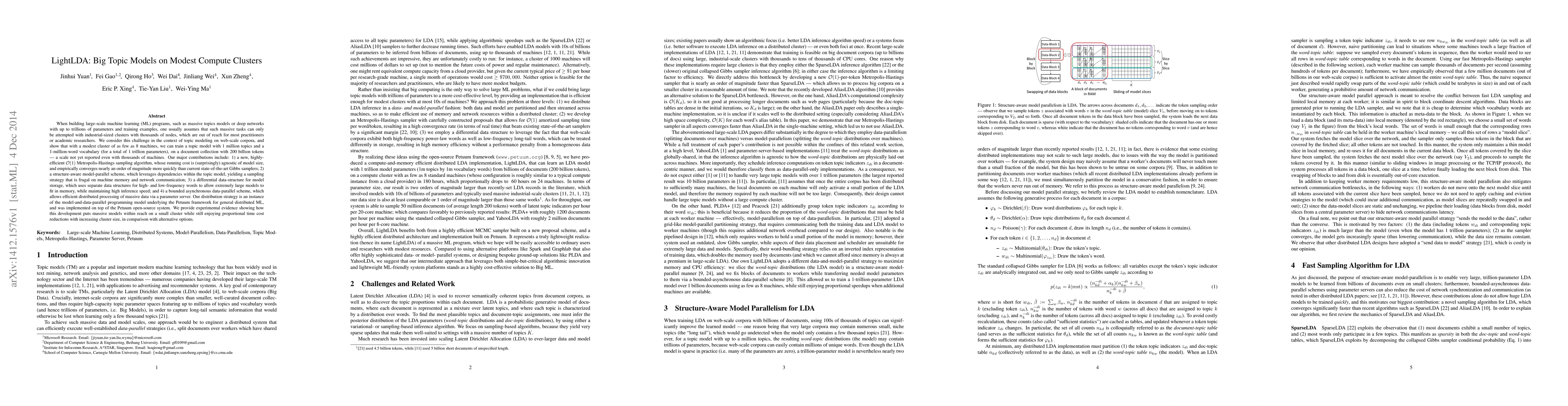 When building large-scale machine learning (ML) programs, such as big topic models or deep neural nets, one usually assumes such tasks can only be attempted with industrial-sized clusters with thousands of nodes, which are out of reach for most practitioners or academic researchers. We consider this challenge in the context of topic modeling on web-scale corpora, and show that with a modest cluster of as few as 8 machines, we can train a topic model with 1 million topics and a 1-million-word vocabulary (for a total of 1 trillion parameters), on a document collection with 200 billion tokens -- a scale not yet reported even with thousands of machines. Our major contributions include: 1) a new, highly efficient O(1) Metropolis-Hastings sampling algorithm, whose running cost is (surprisingly) agnostic of model size, and empirically converges nearly an order of magnitude faster than current state-of-the-art Gibbs samplers; 2) a structure-aware model-parallel scheme, which leverages dependencies within the topic model, yielding a sampling strategy that is frugal on machine memory and network communication; 3) a differential data-structure for model storage, which uses separate data structures for high- and low-frequency words to allow extremely large models to fit in memory, while maintaining high inference speed; and 4) a bounded asynchronous data-parallel scheme, which allows efficient distributed processing of massive data via a parameter server. Our distribution strategy is an instance of the model-and-data-parallel programming model underlying the Petuum framework for general distributed ML, and was implemented on top of the Petuum open-source system. We provide experimental evidence showing how this development puts massive models within reach on a small cluster while still enjoying proportional time cost reductions with increasing cluster size, in comparison with alternative options.