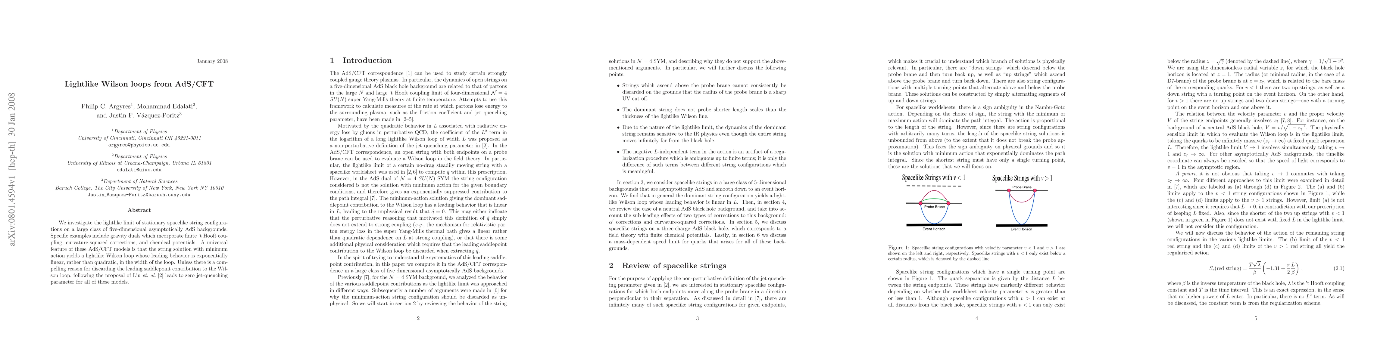 We investigate the lightlike limit of stationary spacelike string configurations on a large class of five-dimensional asymptotically AdS backgrounds. Specific examples include gravity duals which incorporate finite 't Hooft coupling, curvature-squared corrections, and chemical potentials. A universal feature of these AdS/CFT models is that the string solution with minimum action yields a lightlike Wilson loop whose leading behavior is exponentially linear, rather than quadratic, in the width of the loop. Unless there is a compelling reason for discarding the leading saddlepoint contribution to the Wilson loop, following the proposal of Liu et. al. [2] leads to zero jet-quenching parameter for all of these models.