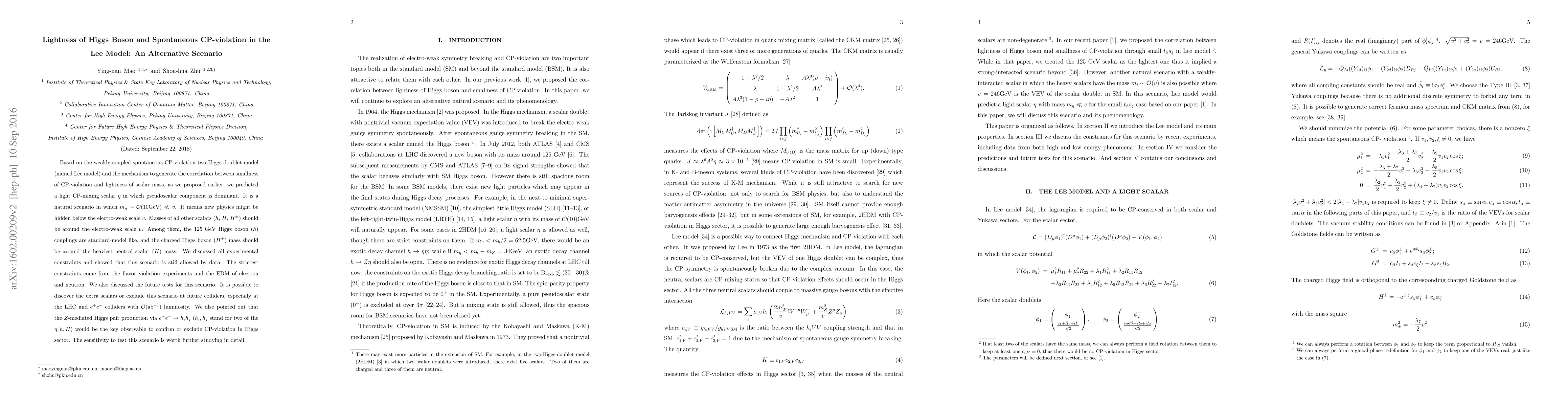 Based on the weakly-coupled two-Higgs-doublet model with spontaneous CP-violation (named Lee model) and the mechanism to generate the correlation between smallness of CP-violation and lightness of scalar mass, as we proposed earlier, we predicted a light CP-mixing scalar $\eta$ in which pseudoscalar component is dominant. It is a natural scenario in which $m_{\eta}\sim\mathcal{O}(10\textrm{GeV})\ll v$. Masses of all other scalars ($h$, $H$, $H^\pm$) should be around the electro-weak scale $v$. Among them, the 125 GeV Higgs ($h$) couplings are standard-model like, and the charged Higgs ($H^\pm$) mass should be around the heaviest neutral scalar ($H$) mass. We discussed all experimental constraints and showed that this scenario is still allowed by data. The strictest constraints come from the experiments of the flavor-changing processes and the EDM of lepton and neutron. We also discussed the future tests for this scenario. It is possible to discover the extra scalars or exclude this scenario at future colliders, especially at the LHC and $e^+e^-$ colliders with $\mathcal{O}(\textrm{ab}^{-1})$ luminosity. We also pointed out that the $Z$-mediated Higgs pair production via $e^+e^-\rightarrow h_ih_j$ ($h_i, h_j$ stand for two of the $\eta, h, H$) would be the key observable to confirm or exclude CP-violation in Higgs sector. The sensitivity to test this scenario is worth further studying in greater detail.