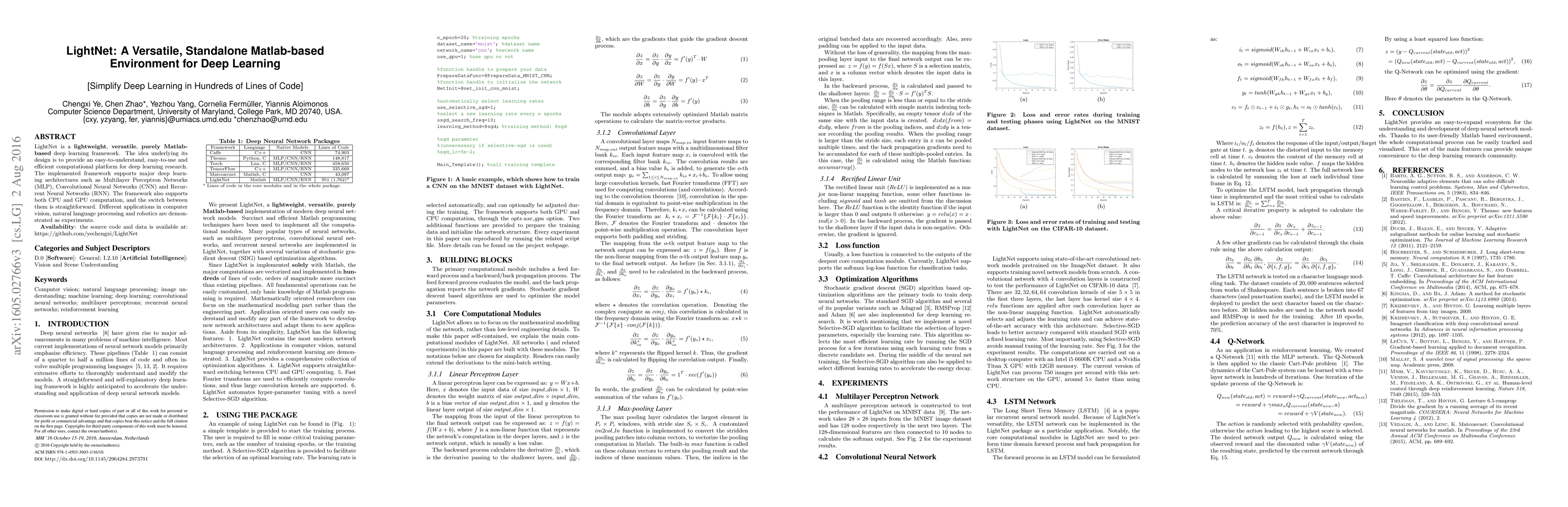 LightNet is a user-friendly, Matlab-based deep learning framework supporting major architectures like MLP, CNN, and RNN, with efficient CPU and GPU computation. It demonstrates applications in computer vision, NLP, and robotics.