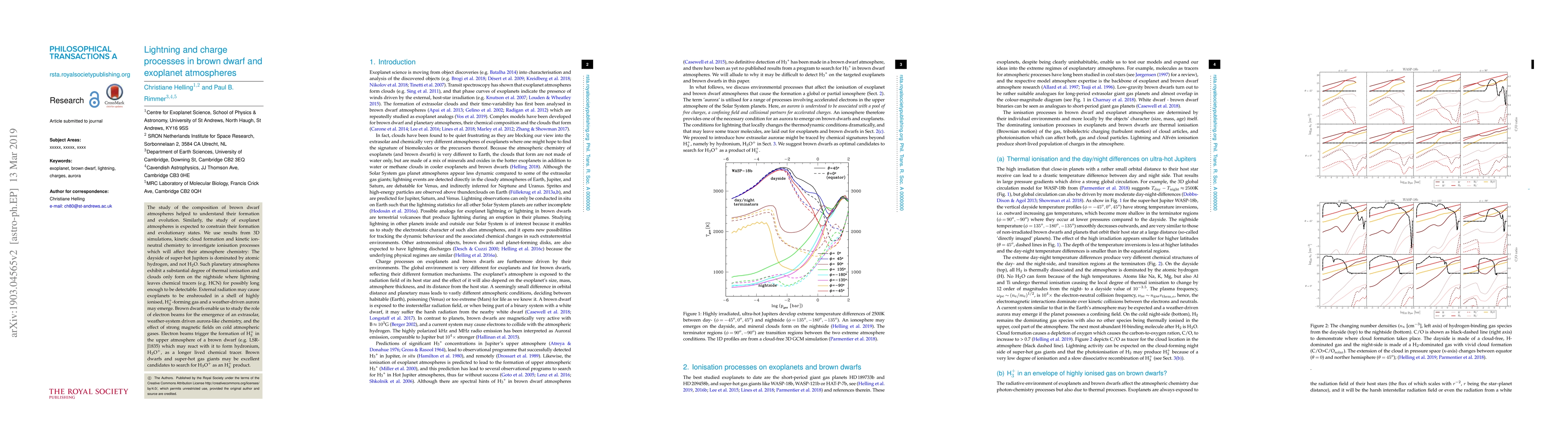 The study of the composition of brown dwarf atmospheres helped to understand their formation and evolution. Similarly, the study of exoplanet atmospheres is expected to constrain their formation and evolutionary states. We use results from 3D simulations, kinetic cloud formation and kinetic ion-neutral chemistry to investigate ionisation processes which will affect their atmosphere chemistry: The dayside of super-hot Jupiters is dominated by atomic hydrogen, and not H$_2$O. Such planetary atmospheres exhibit a substantial degree of thermal ionisation and clouds only form on the nightside where lightning leaves chemical tracers (e.g. HCN) for possibly long enough to be detectable. External radiation may cause exoplanets to be enshrouded in a shell of highly ionised, H$_3^+$-forming gas and a weather-driven aurora may emerge. Brown dwarfs enable us to study the role of electron beams for the emergence of an extrasolar, weather-system driven aurora-like chemistry, and the effect of strong magnetic fields on cold atmospheric gases. Electron beams trigger the formation of H$_3^+$ in the upper atmosphere of a brown dwarf (e.g. LSR-J1835) which may react with it to form hydronium, H$_3$O$^+$, as a longer lived chemical tracer. Brown dwarfs and super-hot gas giants may be excellent candidates to search for H$_3$O$^+$ as an H$_3^+$ product.