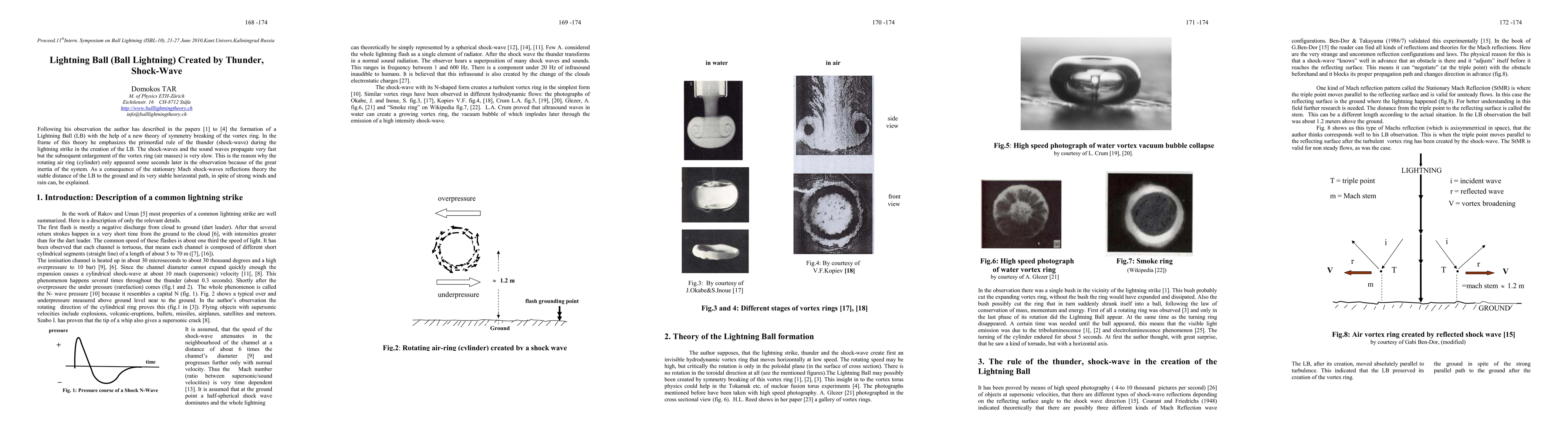 Following his observation the author has described in the papers [1] to [4] the formation of a Lightning Ball (LB)with the help of a new theory of symmetry breaking of the vortex ring. In the frame of this theory he emphasizes the primordial rule of the thunder (shock-wave) during the lightning strike in the creation of the LB. The shock-waves and the sound waves propagate very fast but the subsequent enlargement of the vortex ring (air masses) is very slow. This is the reason why the rotating air ring (cylinder) only appeared some seconds later in the observation because of the great inertia of the system. As a consequence of the stationary Mach shock-waves reflections theory the stable distance of the LB to the ground and its very stable horizontal path, in spite of strong winds and rain can be explained.
