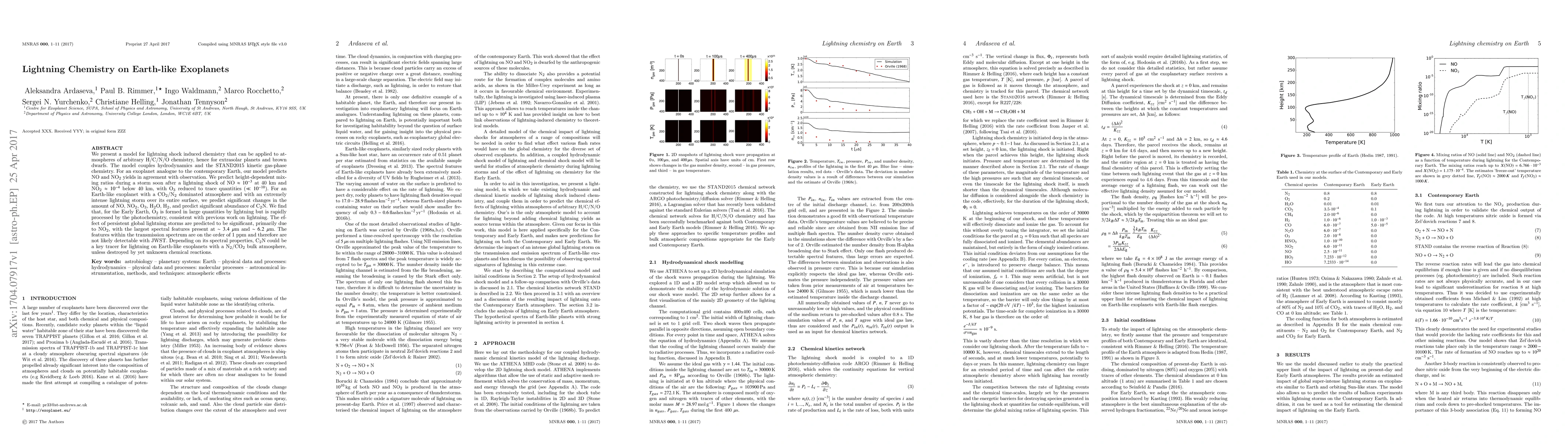 We present a model for lightning shock induced chemistry that can be applied to atmospheres of arbitrary H/C/N/O chemistry, hence for extrasolar planets and brown dwarfs. The model couples hydrodynamics and the STAND2015 kinetic gas-phase chemistry. For an exoplanet analogue to the contemporary Earth, our model predicts NO and NO2 yields in agreement with observation. We predict height-dependent mixing ratios during a storm soon after a lightning shock of NO ~ 1e-3 at 40 km and NO2 ~ 1e-4 below 40 km, with O3 reduced to trace quantities (<< 1e-10). For an Earth-like exoplanet with a CO2/N2 dominated atmosphere and with an extremely intense lightning storm over its entire surface, we predict significant changes in the amount of NO, NO2, O3, H2O, H2, and predict significant abundance of C2N. We find that, for the Early Earth, O2 is formed in large quantities by lightning but is rapidly processed by the photochemistry, consistent with previous work on lightning. The effect of persistent global lightning storms are predicted to be significant, primarily due to NO2, with the largest spectral features present at ~3.4 {\mu}m and ~6.2 {\mu}m. The features within the transmission spectrum are on the order of 1 ppm and therefore are not likely detectable with JWST. Depending on its spectral properties, C2N could be a key tracer for lightning on Earth-like exoplanets with a N2/CO2 bulk atmosphere, unless destroyed by yet unknown chemical reactions.