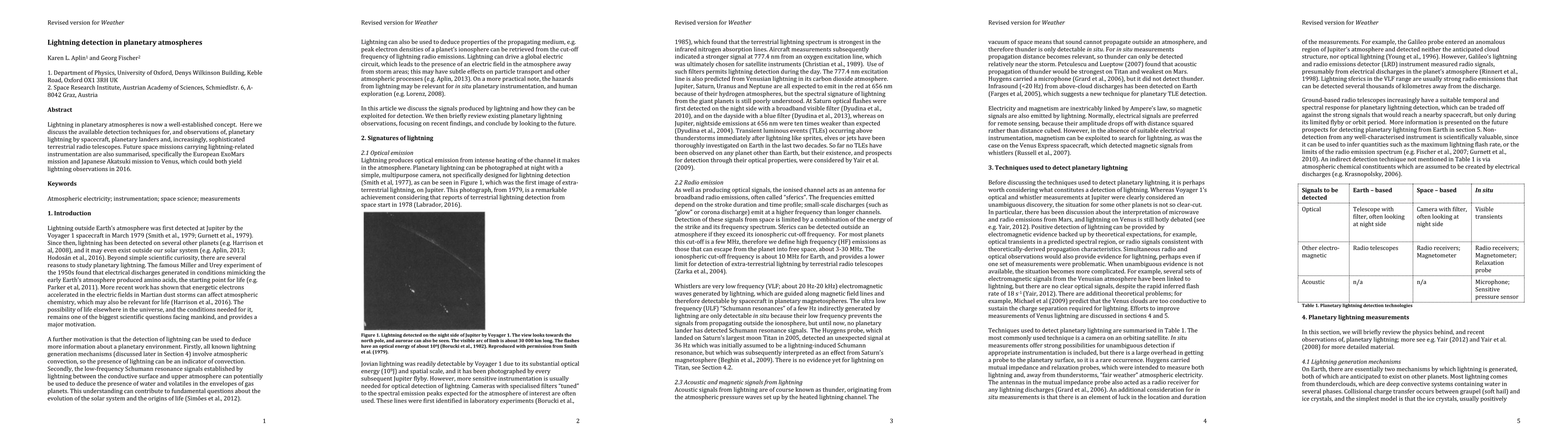 This paper reviews current techniques for detecting lightning in planetary atmospheres using spacecraft, landers, and terrestrial radio telescopes, and highlights upcoming missions like the European ExoMars and Japanese Akatsuki missions to Venus, expected to provide new lightning observation data in 2016.