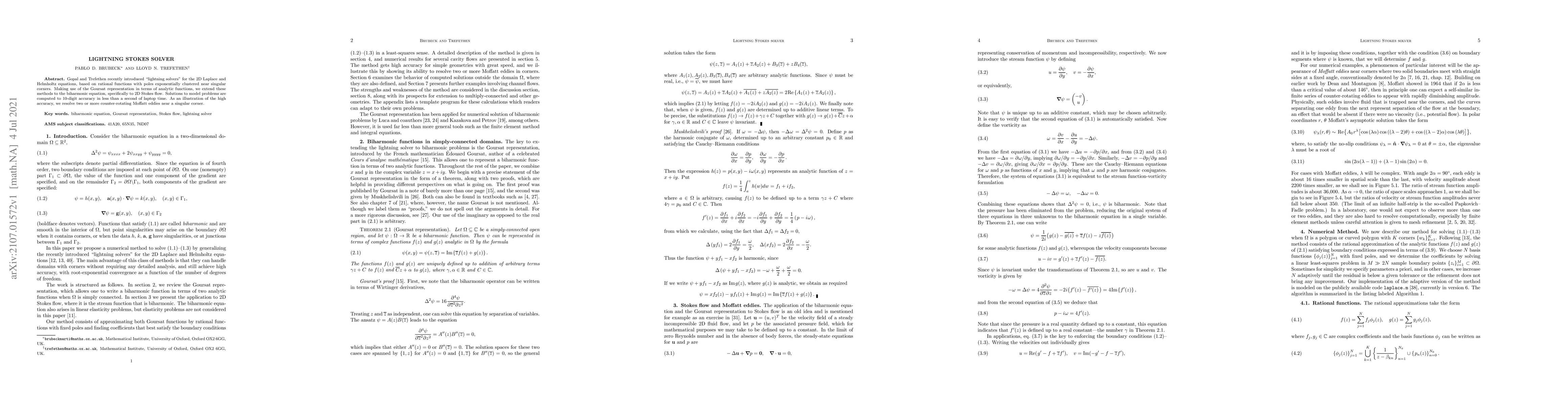 Gopal and Trefethen recently introduced "lightning solvers" for the 2D Laplace and Helmholtz equations, based on rational functions with poles exponentially clustered near singular corners. Making use of the Goursat representation in terms of analytic functions, we extend these methods to the biharmonic equation, specifically to 2D Stokes flow. Solutions to model problems are computed to 10-digit accuracy in less than a second of laptop time. As an illustration of the high accuracy, we resolve two or more counter-rotating Moffatt eddies near a singular corner.
