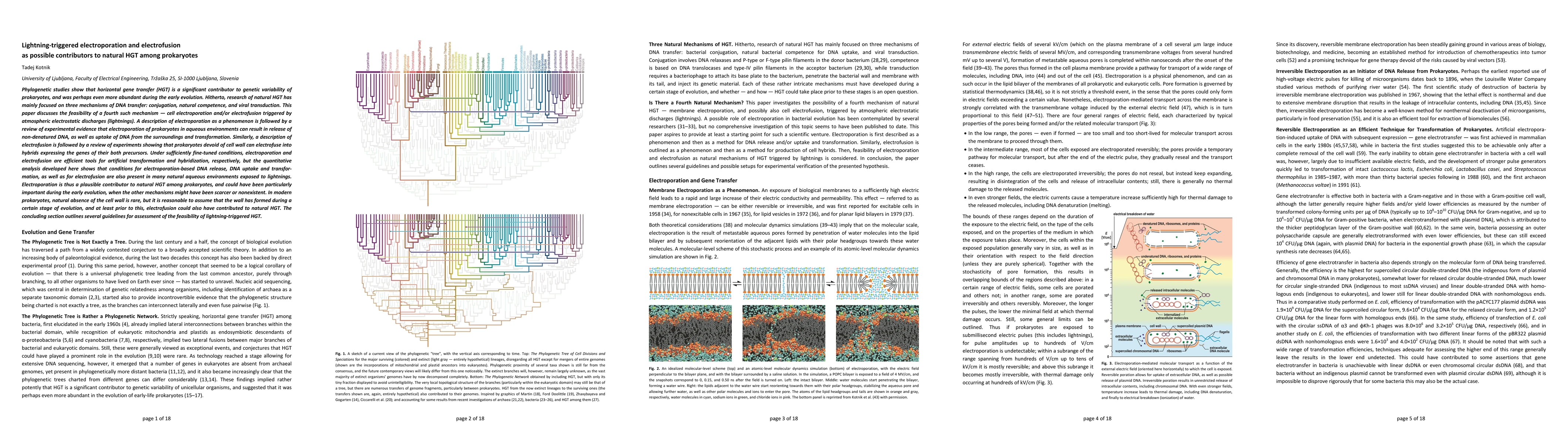 This paper explores the potential of lightning-triggered electroporation and electrofusion as mechanisms for natural horizontal gene transfer (HGT) among prokaryotes, suggesting that these processes could have been significant during early evolutionary stages when other HGT mechanisms were less prevalent.
