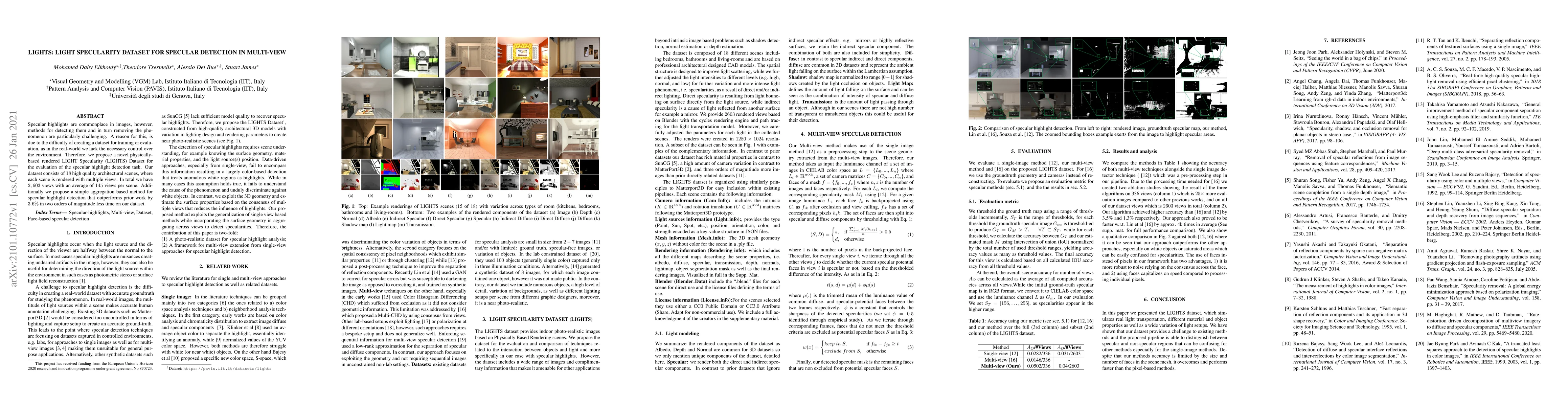 The LIGHTS Dataset offers a physically-rendered collection of 18 architectural scenes with 2,603 views to evaluate specular highlight detection. The authors also propose an efficient aggregation-based method that outperforms existing techniques by 3.6% accuracy in significantly less time.