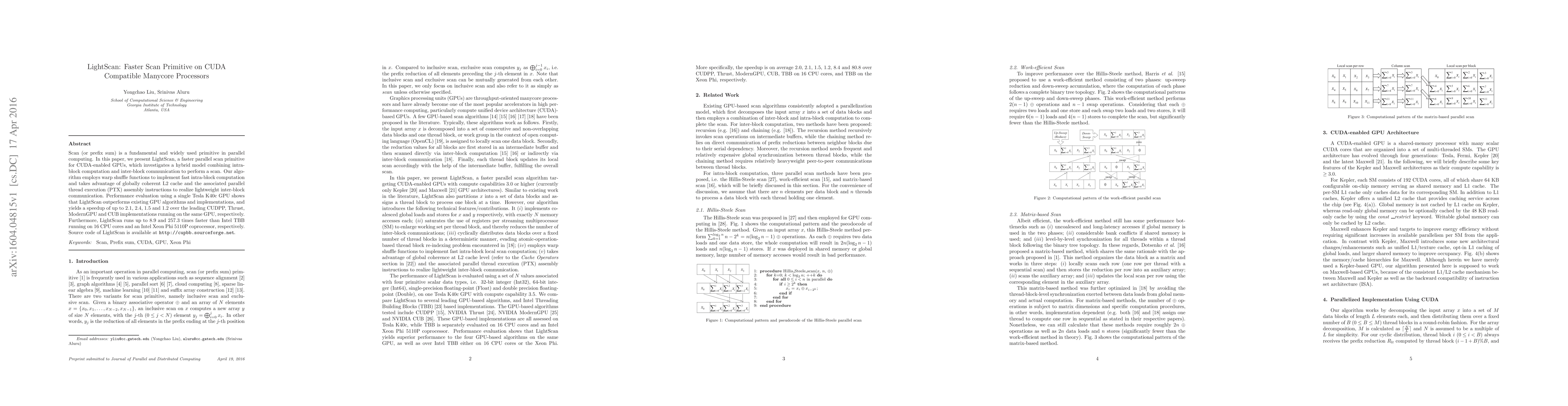 Scan (or prefix sum) is a fundamental and widely used primitive in parallel computing. In this paper, we present LightScan, a faster parallel scan primitive for CUDA-enabled GPUs, which investigates a hybrid model combining intra-block computation and inter-block communication to perform a scan. Our algorithm employs warp shuffle functions to implement fast intra-block computation and takes advantage of globally coherent L2 cache and the associated parallel thread execution (PTX) assembly instructions to realize lightweight inter-block communication. Performance evaluation using a single Tesla K40c GPU shows that LightScan outperforms existing GPU algorithms and implementations, and yields a speedup of up to 2.1, 2.4, 1.5 and 1.2 over the leading CUDPP, Thrust, ModernGPU and CUB implementations running on the same GPU, respectively. Furthermore, LightScan runs up to 8.9 and 257.3 times faster than Intel TBB running on 16 CPU cores and an Intel Xeon Phi 5110P coprocessor, respectively. Source code of LightScan is available at http://cupbb.sourceforge.net.