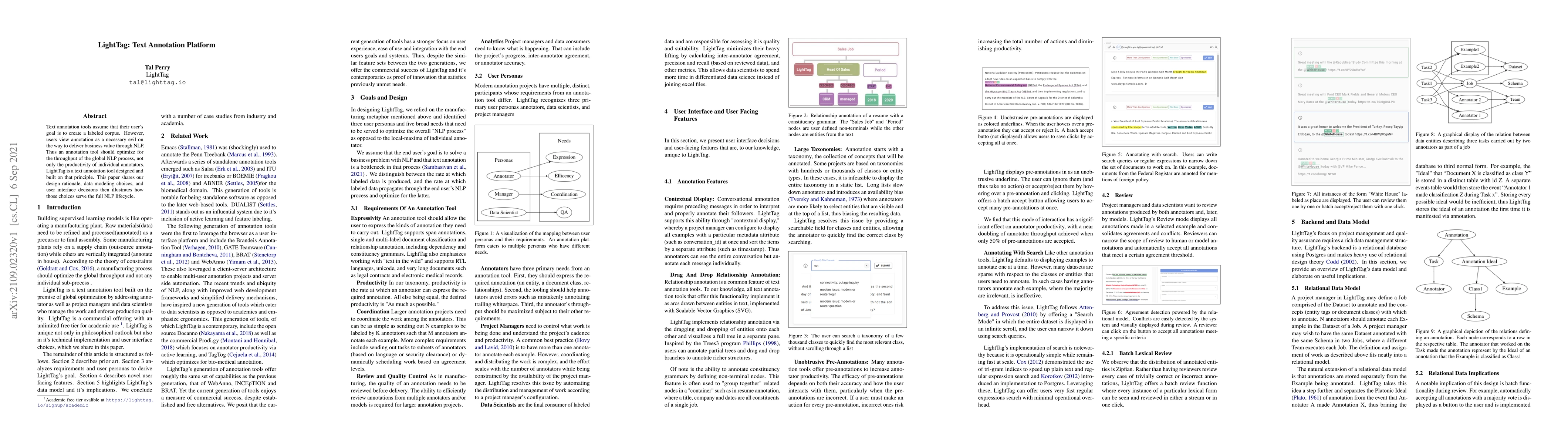 LightTag is a text annotation platform designed to optimize the overall NLP process rather than just individual annotator productivity. The paper discusses its design rationale, data modeling, and user interface choices, demonstrating how these elements support the full NLP lifecycle.