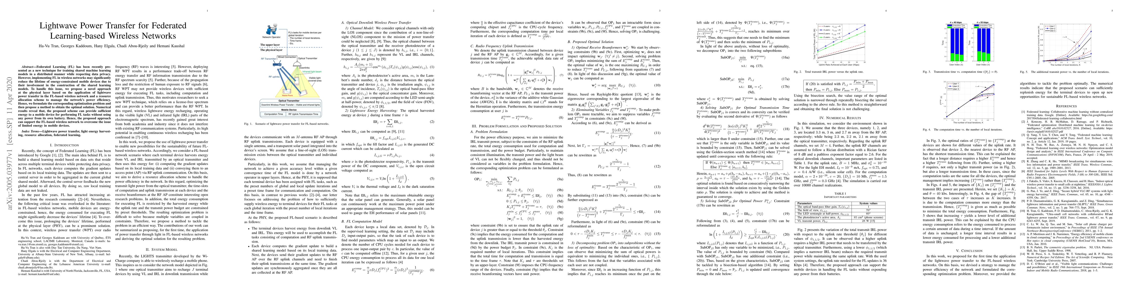 Federated Learning (FL) has been recently presented as a new technique for training shared machine learning models in a distributed manner while respecting data privacy. However, implementing FL in wireless networks may significantly reduce the lifetime of energy-constrained mobile devices due to their involvement in the construction of the shared learning models. To handle this issue, we propose a novel approach at the physical layer based on the application of lightwave power transfer in the FL-based wireless network and a resource allocation scheme to manage the network's power efficiency. Hence, we formulate the corresponding optimization problem and then propose a method to obtain the optimal solution. Numerical results reveal that, the proposed scheme can provide sufficient energy to a mobile device for performing FL tasks without using any power from its own battery. Hence, the proposed approach can support the FL-based wireless network to overcome the issue of limited energy in mobile devices.