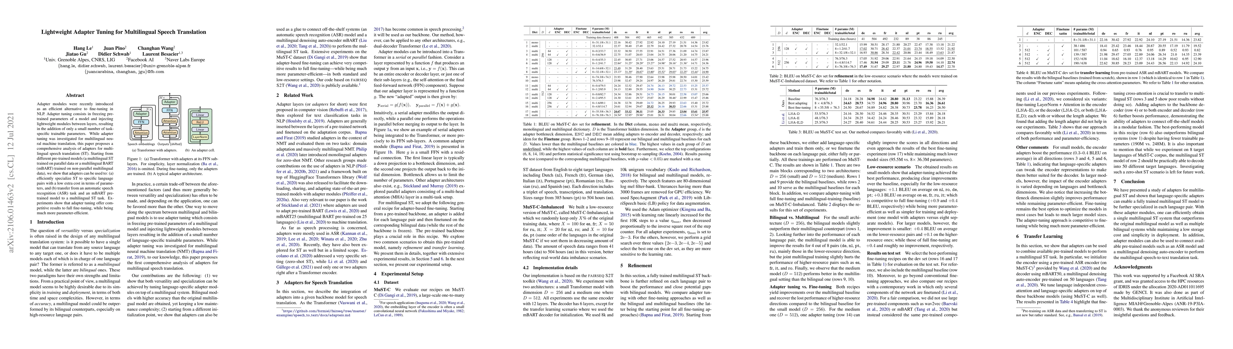 This paper investigates lightweight adapter tuning for multilingual speech translation, demonstrating its efficiency compared to full fine-tuning. It shows that adapters can specialize speech translation to specific language pairs with minimal parameter overhead and effectively transfer knowledge from ASR and mBART models.