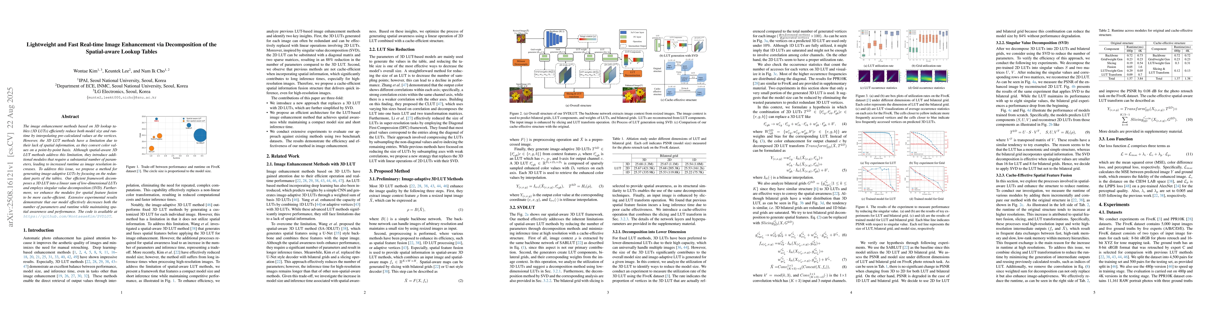 The image enhancement methods based on 3D lookup tables (3D LUTs) efficiently reduce both model size and runtime by interpolating pre-calculated values at the vertices. However, the 3D LUT methods have a limitation due to their lack of spatial information, as they convert color values on a point-by-point basis. Although spatial-aware 3D LUT methods address this limitation, they introduce additional modules that require a substantial number of parameters, leading to increased runtime as image resolution increases. To address this issue, we propose a method for generating image-adaptive LUTs by focusing on the redundant parts of the tables. Our efficient framework decomposes a 3D LUT into a linear sum of low-dimensional LUTs and employs singular value decomposition (SVD). Furthermore, we enhance the modules for spatial feature fusion to be more cache-efficient. Extensive experimental results demonstrate that our model effectively decreases both the number of parameters and runtime while maintaining spatial awareness and performance.
