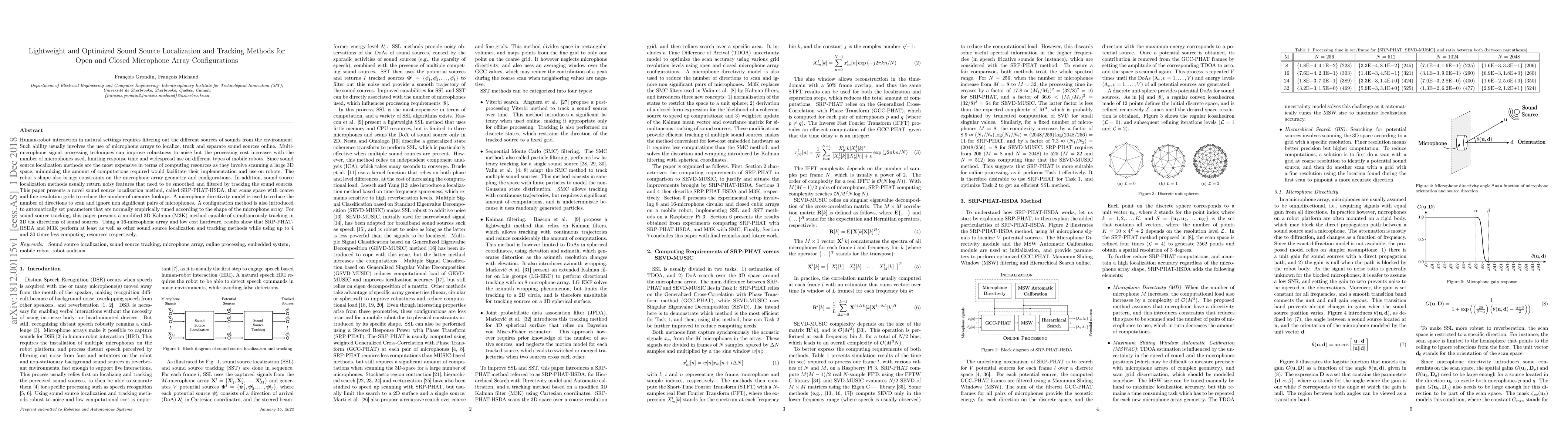 This paper introduces SRP-PHAT-HSDA, a lightweight sound source localization method, and M3K, a modified 3D Kalman filter for tracking, both optimized for low-resource environments. The methods reduce computational costs and improve localization accuracy for human-robot interaction.