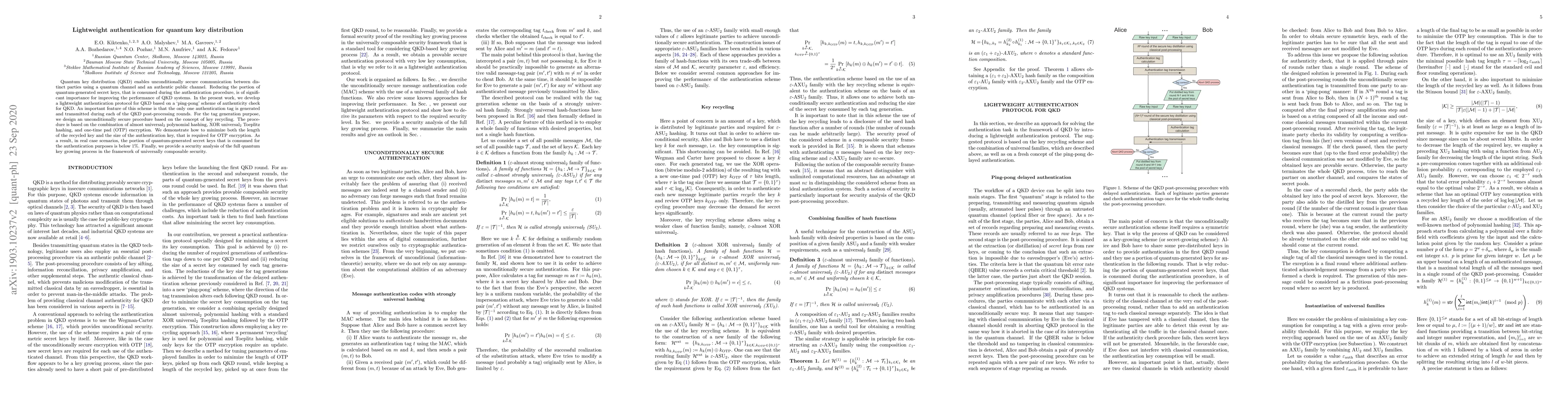 This paper proposes a lightweight authentication protocol for quantum key distribution (QKD) that minimizes the quantum keys used during the authentication process. The protocol employs a "ping-pong" scheme with a single authentication tag per round, utilizing key recycling, almost universal polynomial hashing, and XOR universal Toeplitz hashing, achieving less than 1% consumption of quantum keys for authentication.