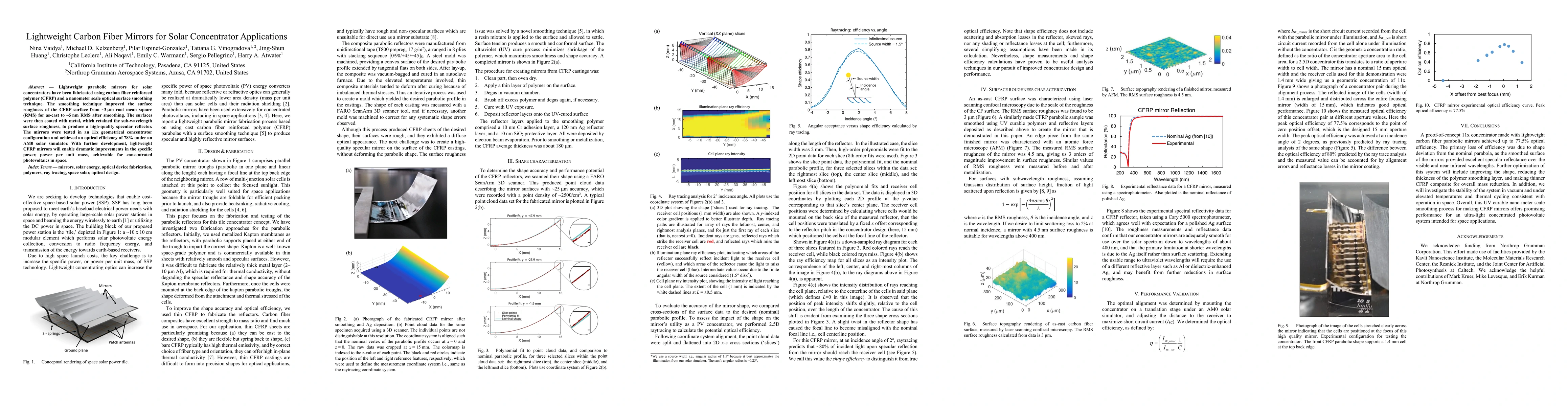 This paper presents lightweight carbon fiber reinforced polymer mirrors fabricated using advanced optical smoothing techniques, achieving high optical efficiency of 78% in a solar concentrator setup, promising significant enhancements in space-based concentrated photovoltaics.