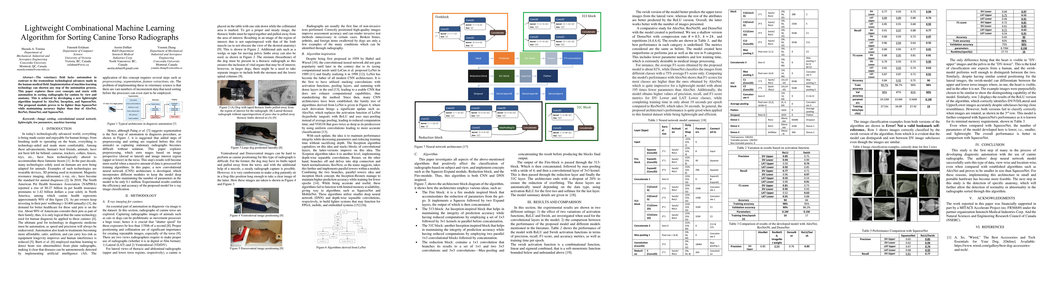 The veterinary field lacks automation in contrast to the tremendous technological advances made in the human medical field. Implementation of machine learning technology can shorten any step of the automation process. This paper explores these core concepts and starts with automation in sorting radiographs for canines by view and anatomy. This is achieved by developing a new lightweight algorithm inspired by AlexNet, Inception, and SqueezeNet. The proposed module proves to be lighter than SqueezeNet while maintaining accuracy higher than that of AlexNet, ResNet, DenseNet, and SqueezeNet.