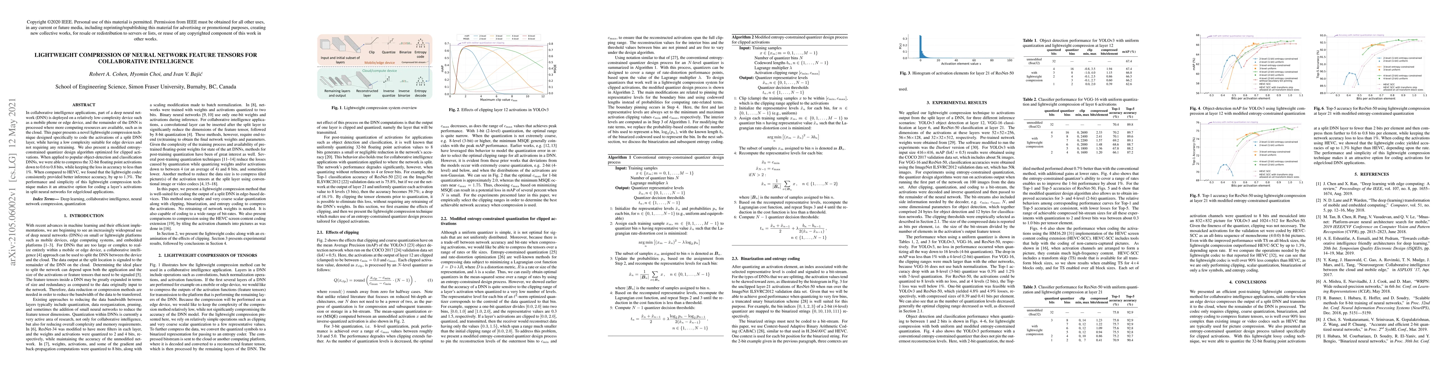 This paper introduces a lightweight compression technique for neural network feature tensors in split DNNs, achieving compression down to 0.6 to 0.8 bits with minimal accuracy loss (<1%). The method outperforms HEVC in inference accuracy by up to 1.3%, making it suitable for edge/cloud collaborative intelligence applications.