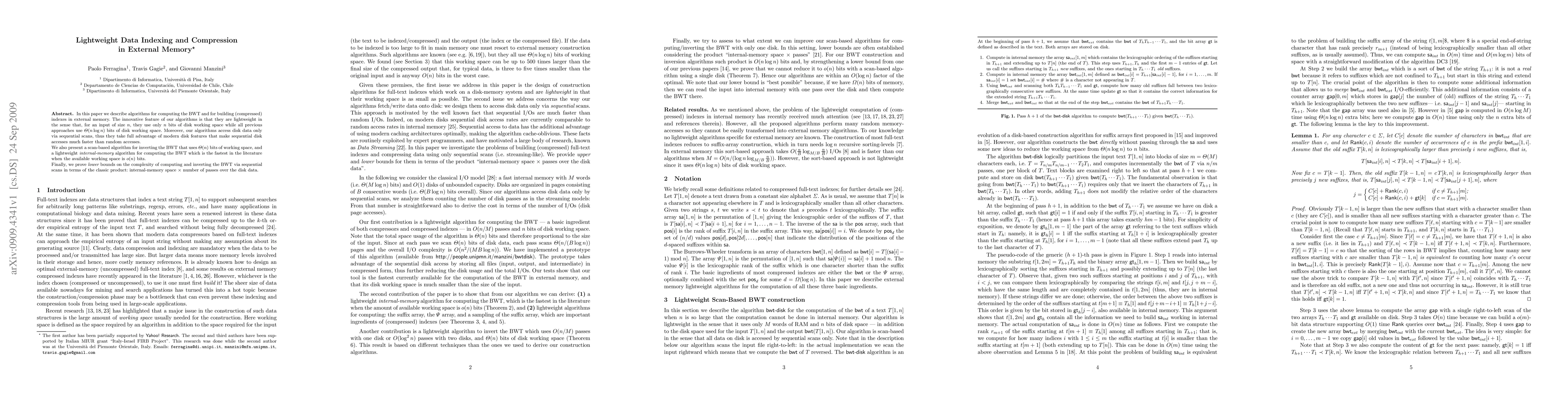 This paper introduces lightweight algorithms for computing the BWT and building compressed indexes in external memory, using only $n$ bits of disk working space compared to previous approaches that require $n \log n$ bits. The algorithms leverage sequential disk accesses for efficiency.