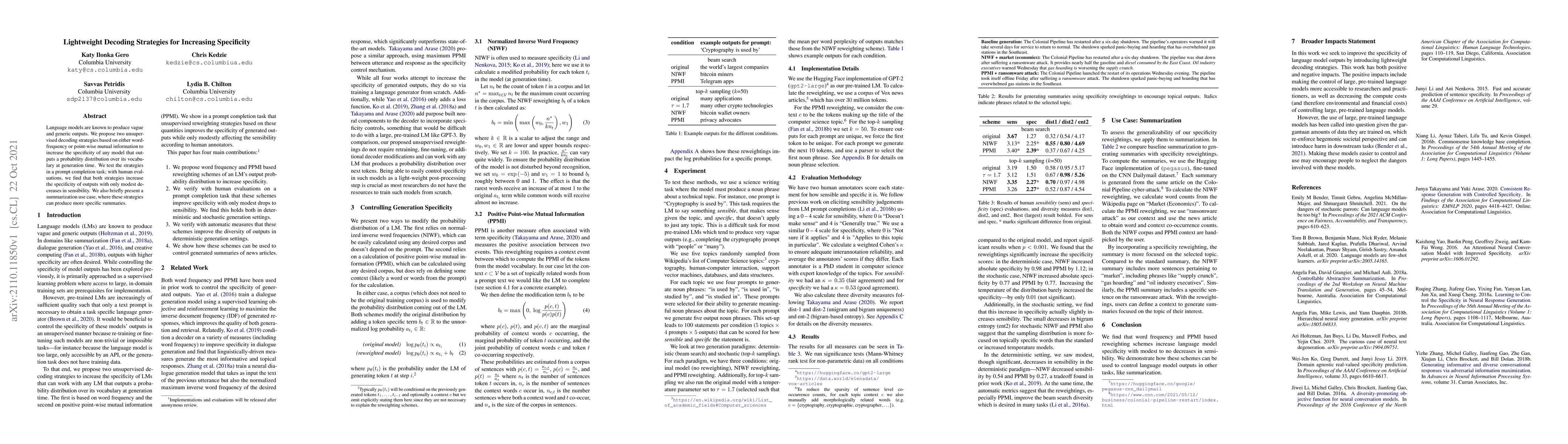 Language models are known to produce vague and generic outputs. We propose two unsupervised decoding strategies based on either word-frequency or point-wise mutual information to increase the specificity of any model that outputs a probability distribution over its vocabulary at generation time. We test the strategies in a prompt completion task; with human evaluations, we find that both strategies increase the specificity of outputs with only modest decreases in sensibility. We also briefly present a summarization use case, where these strategies can produce more specific summaries.
