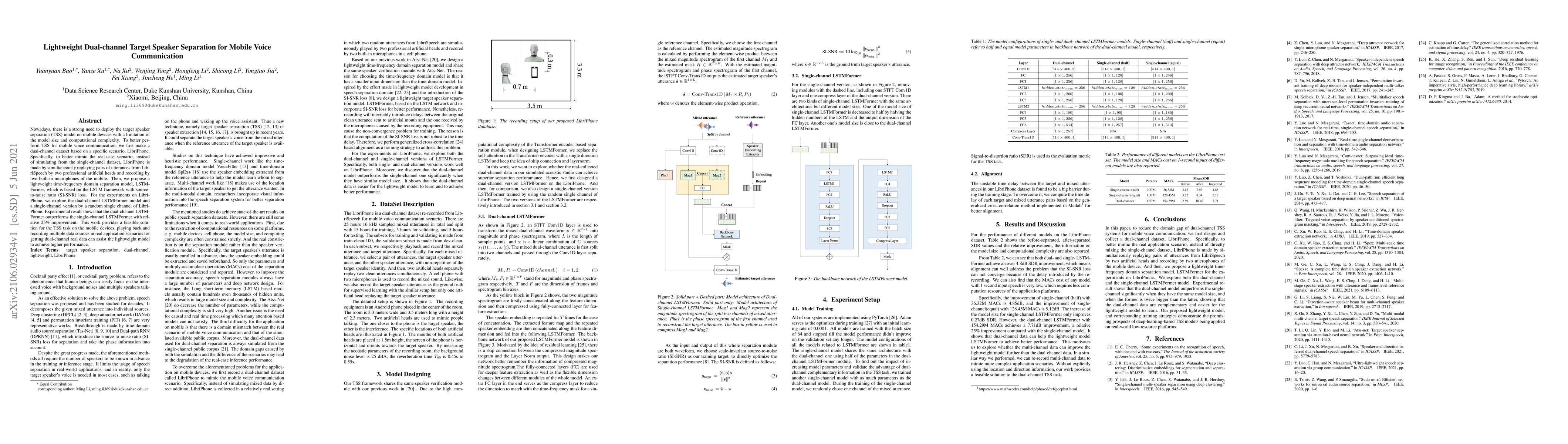 Nowadays, there is a strong need to deploy the target speaker separation (TSS) model on mobile devices with a limitation of the model size and computational complexity. To better perform TSS for mobile voice communication, we first make a dual-channel dataset based on a specific scenario, LibriPhone. Specifically, to better mimic the real-case scenario, instead of simulating from the single-channel dataset, LibriPhone is made by simultaneously replaying pairs of utterances from LibriSpeech by two professional artificial heads and recording by two built-in microphones of the mobile. Then, we propose a lightweight time-frequency domain separation model, LSTM-Former, which is based on the LSTM framework with source-to-noise ratio (SI-SNR) loss. For the experiments on Libri-Phone, we explore the dual-channel LSTMFormer model and a single-channel version by a random single channel of Libri-Phone. Experimental result shows that the dual-channel LSTM-Former outperforms the single-channel LSTMFormer with relative 25% improvement. This work provides a feasible solution for the TSS task on mobile devices, playing back and recording multiple data sources in real application scenarios for getting dual-channel real data can assist the lightweight model to achieve higher performance.