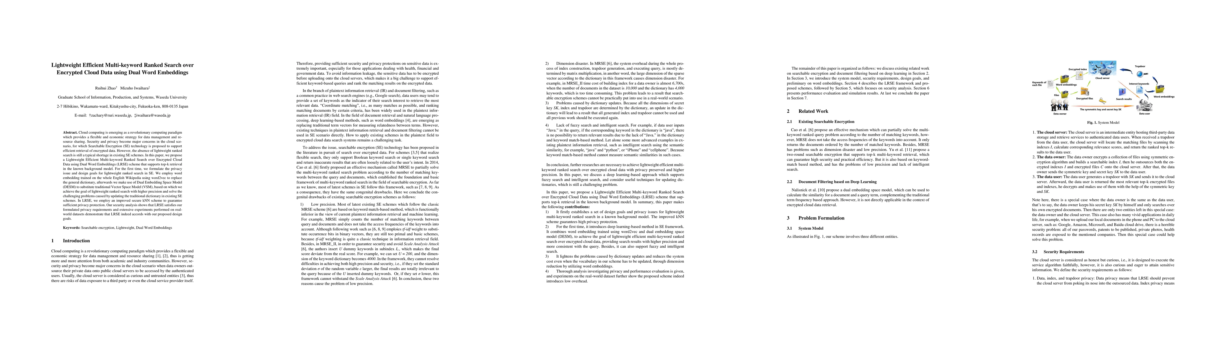 This paper proposes a Lightweight Efficient Multi-keyword Ranked Search over Encrypted Cloud Data using Dual Word Embeddings (LRSE) scheme to address the lack of lightweight ranked search in existing Searchable Encryption (SE) technologies. The LRSE scheme utilizes word2vec embeddings and a Dual Embedding Space Model (DESM) to enhance precision and efficiency, while an improved secure kNN scheme ensures privacy protection.